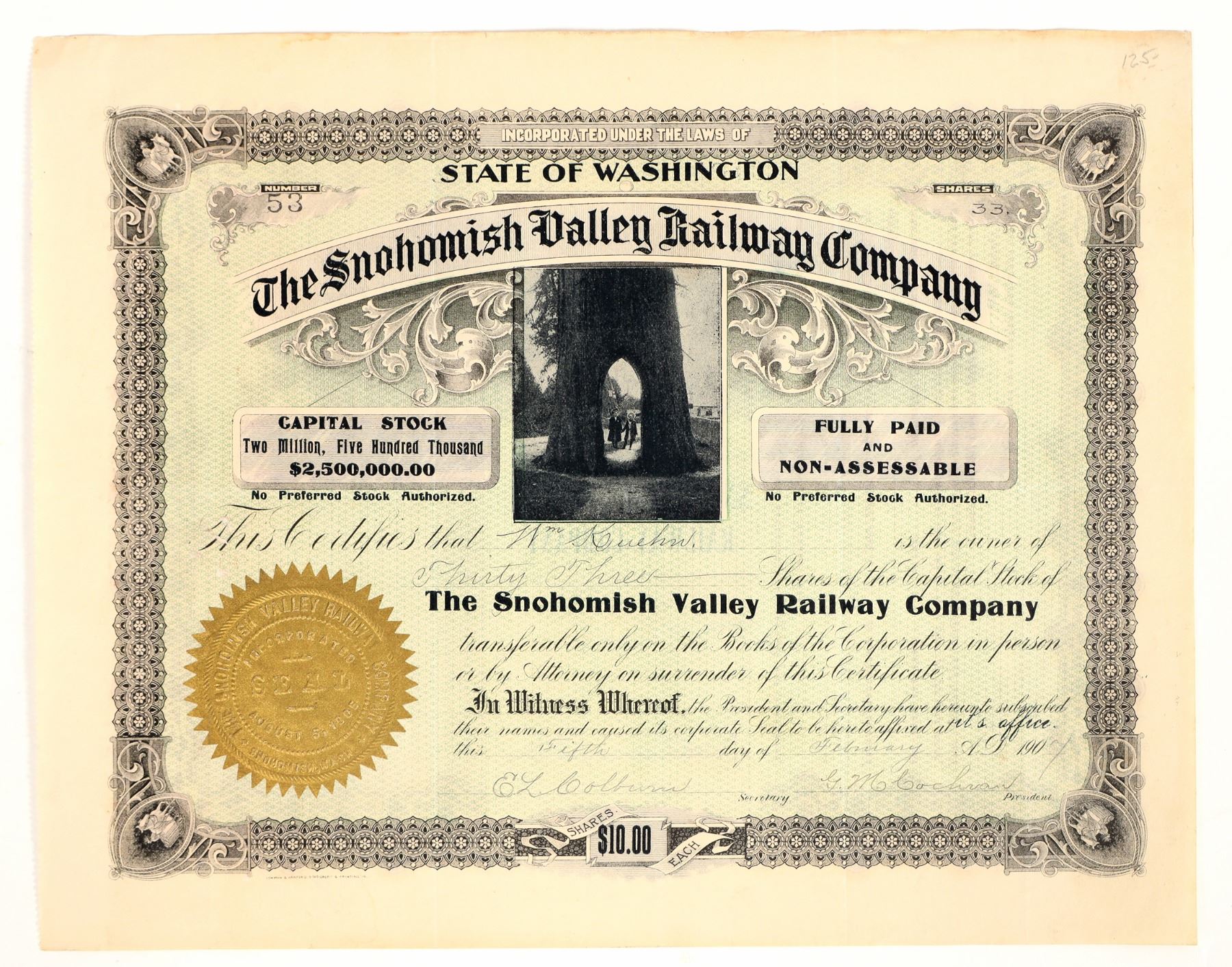 Gorgeous!!! Inc. in 1905 in Washington. No. 53, issued for 33 shares on Feb. 5th, 1907. Signed by G.M. Cochran (president) and EL Colburn (secretary). Ornate black border, green background, a stunning vignette of two people standing under large tree with tunnel through it. Gold seal. Lowman & Hanford Stationery & Printing Co. Folds and light soiling.