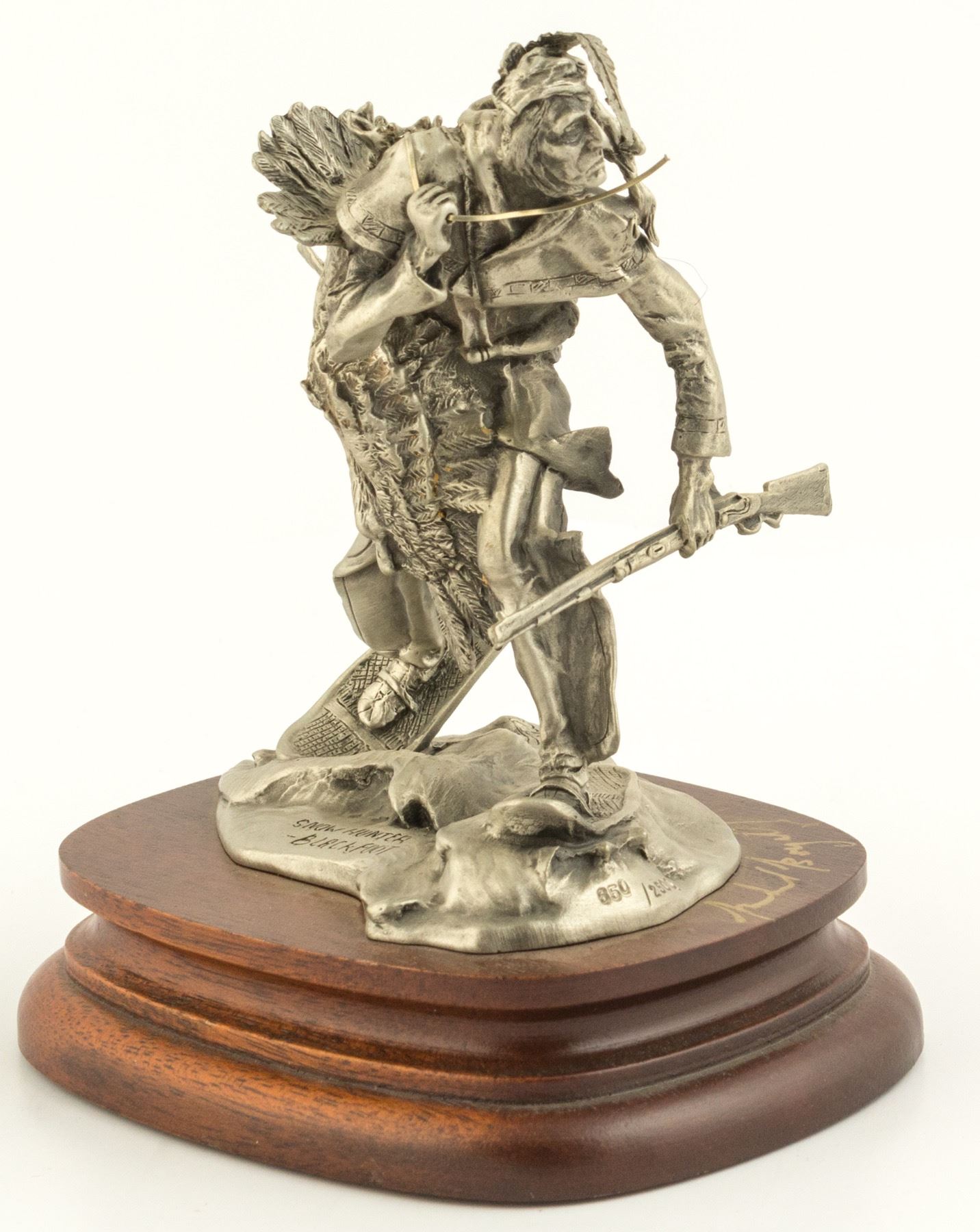 "Snow Hunter, Blackfoot" by Michael Boyett. Pewter sculpture, # 650 / 2500. 4" x 3.5" x 2.25". State: Texas City: HWAC#: 48157 Date: 1980