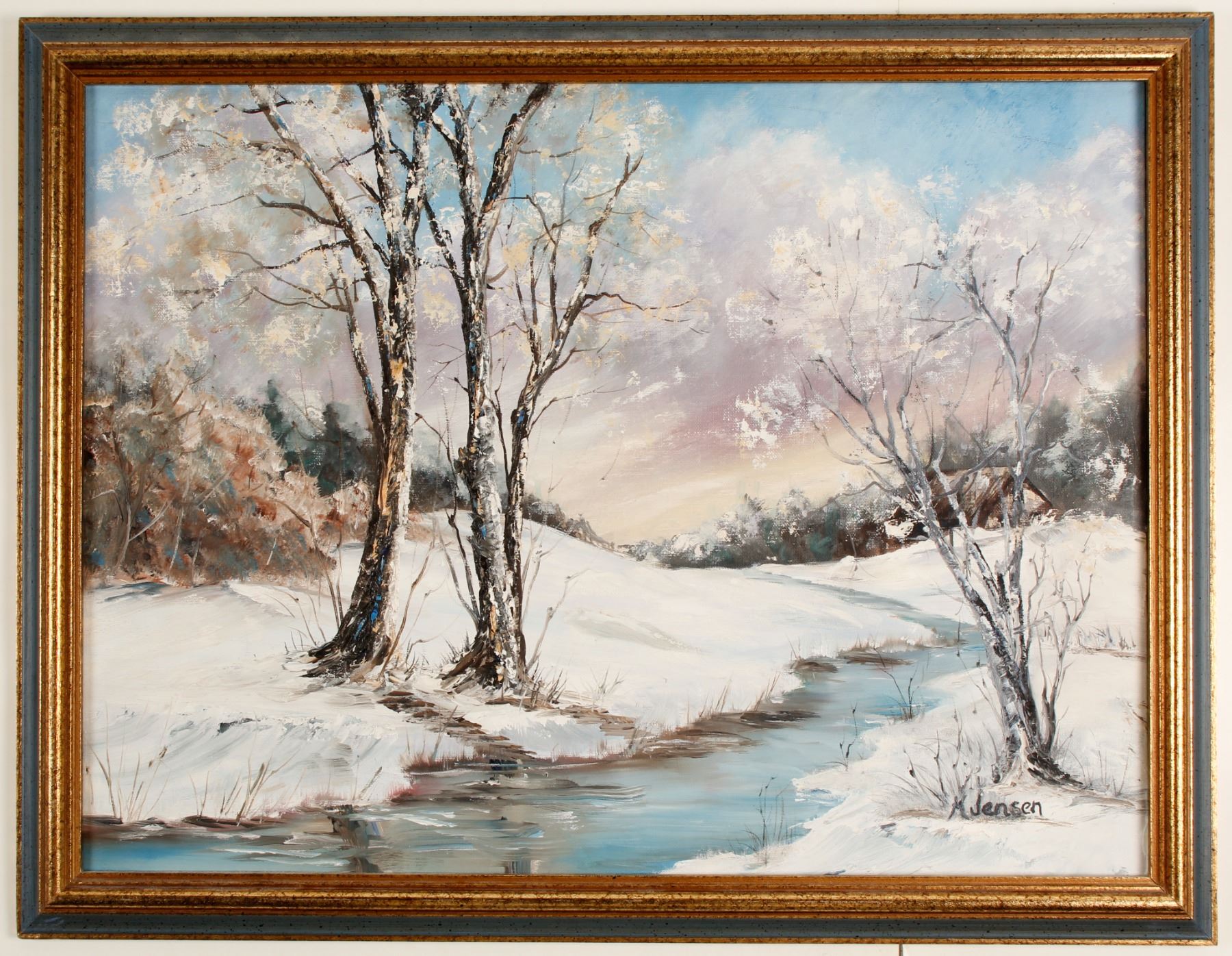 Painting by M. Jensen of a snow scene, trees, mountains, creek. Oil on board, 18 x 24; framed, 20.5 x 25.5". Could not find information on the artist, however, may be Danish. Good condition.