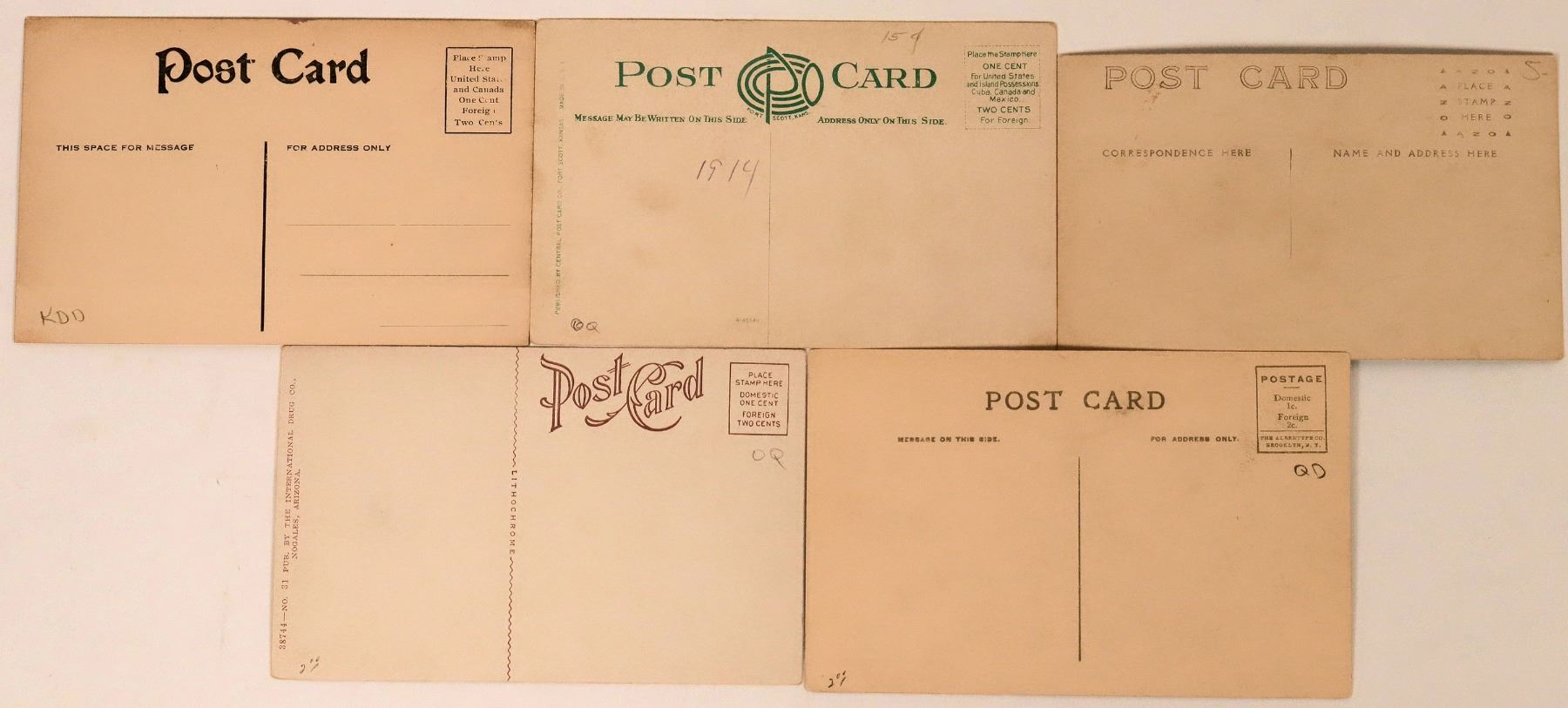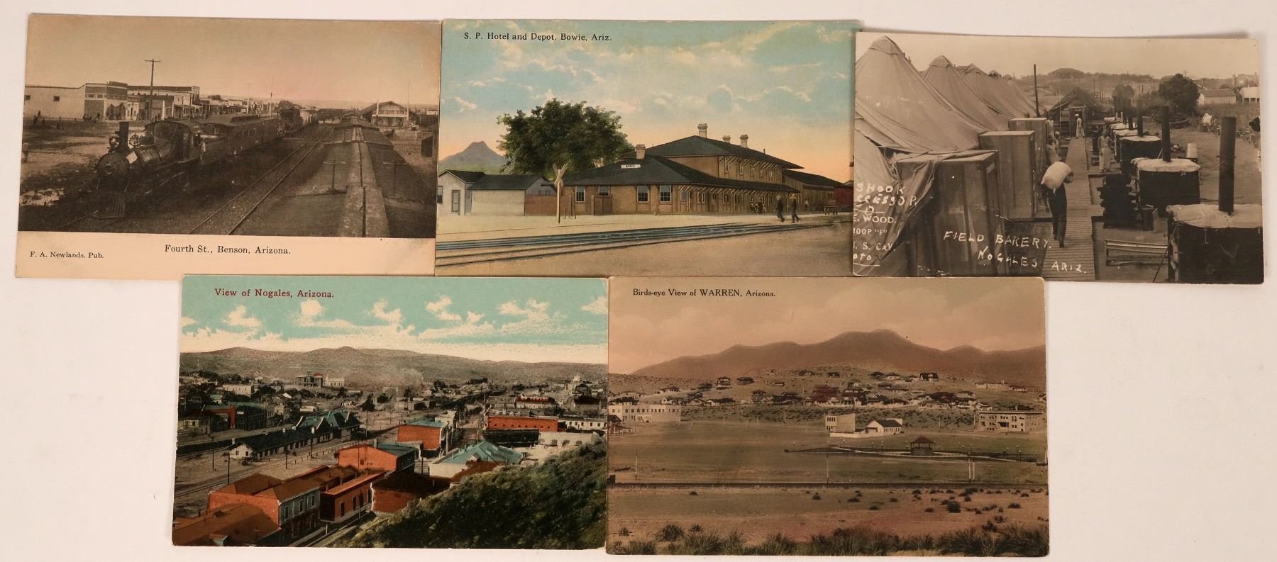 Nice grouping of postcards featuring the cities of Benson, Bowie, Nogales and Warren, AZ. The Benson postcard is a scene on Fourth St, with a train on the track in the foreground and the town in the background, and is published by F.A. Newlands, Pub. A nice color postcard of S. P. Hotel and Depot in Bowie, AZ. published by Central Post Card Co., Fort Scott, Kansas. Includes two postcards of Nogales, AZ. now in Sonora, Mexico. One is a real photo postcard "Field Bakery."One bird's eye view of Warren, AZ. Great small group of southern Arizona postcards.