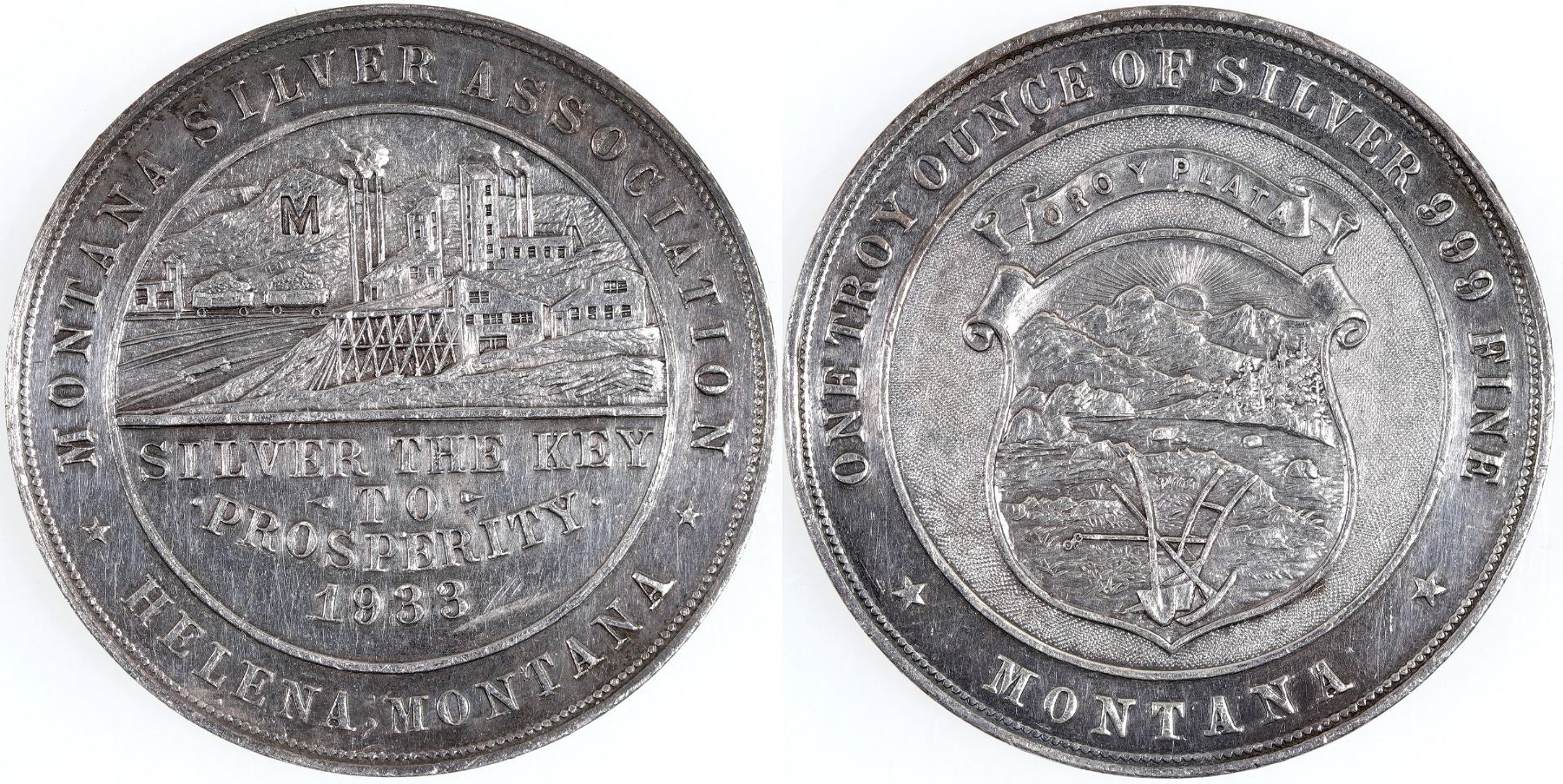 HK 820 from the Montana Silver Association. Obv. Mining scene in upper center portion, incused M upon hillside; lower center panel inscribed Silver the Key / to / ï Prosperity ï / 1933; circle around all; between circle and beaded border, * Montana Silver Association * Helena, Montana; Rev. Modification of Montana State Seal, engraved on shield in bas-relief, with inscription Oro y Plata (Gold and Silver) in scroll above shield; legend above, around, * One Troy Ounce of Silver 999 Fine *; below, Montana. Silver. 40mm. BU condition. Of the 2225 struck, less than one hundred are known to exist. Montana 1933