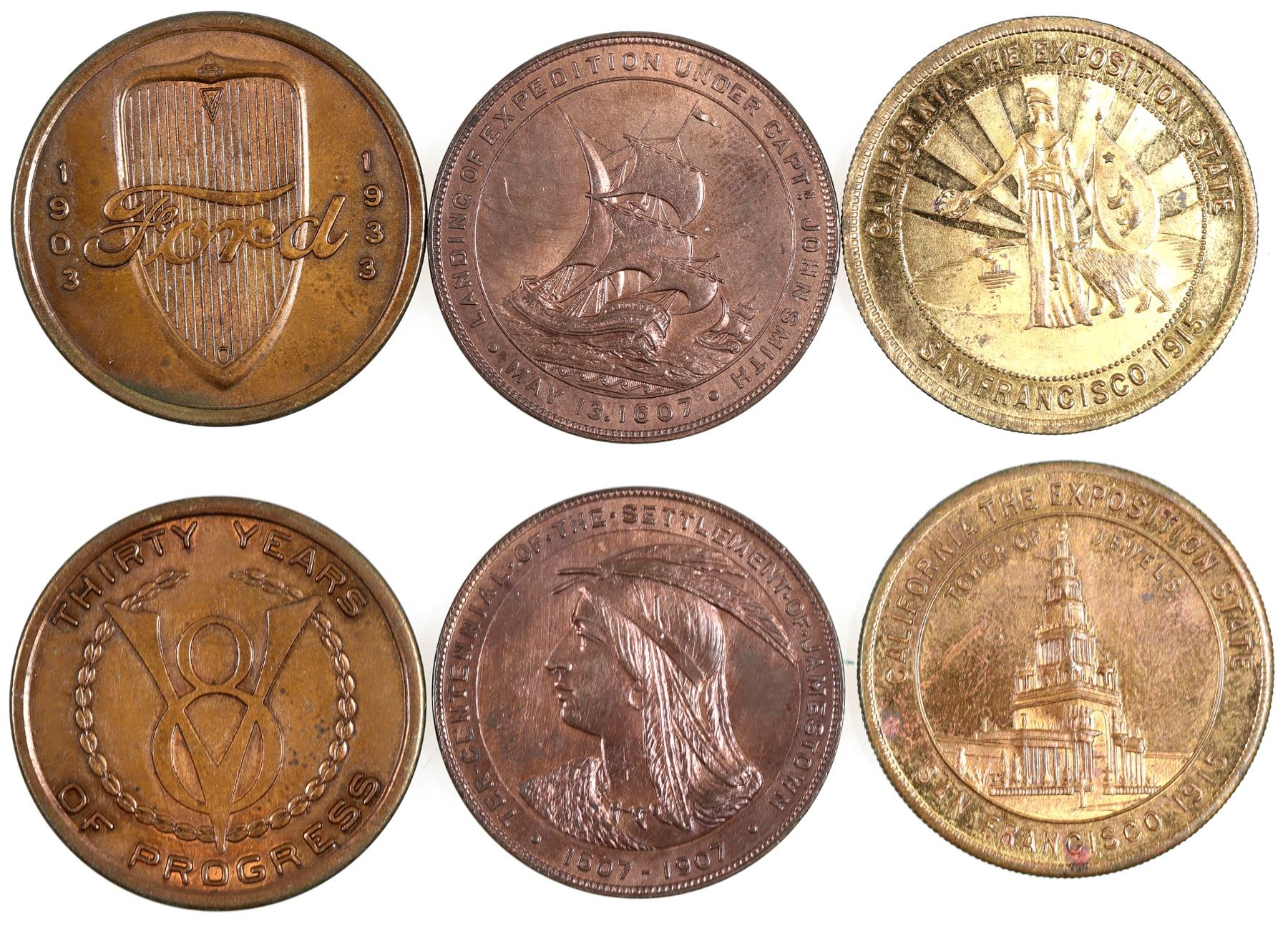 Lot of three So Called Dollars in excellent condition: 1) HK 415A: California The Exposition State, Unc.; 2) HK 346: Jamestown Tercentennial Exposition 1907, AU-BU original patina; 3) HK 465: Ford Thirty Years of Progress 1933, BU.