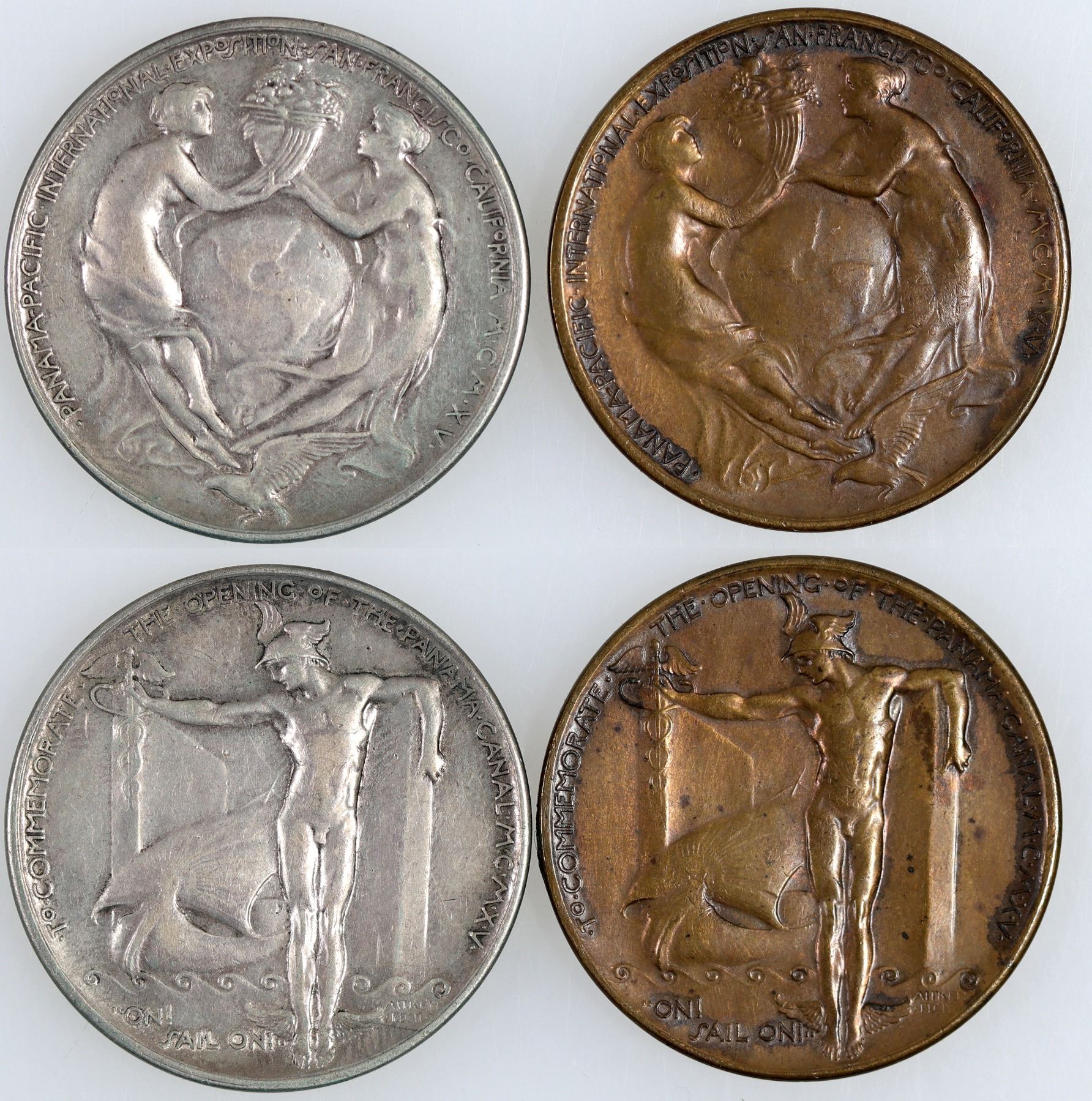 Two 1915 Panama Pacific International Exposition So Called Dollars, both in AU-BU condition: 1) HK 399 in silver, R 5; 2) HK 400 in bronze, R 4. Obv. Winged Mercury opens Canal locks, through which passes Argo, symbol of navigation, setting sun reflecting on her sails; below vessel "On! / Sail On!"; at lower r. edge Aitken / Fecit.; legend around ï To ï Commemorate ï the ï Opening ï of ï the ï Panama ï Canal ï MïCïMïXïVï; Rev. Two females, representing the two hemispheres, entwined about earth and holding in hands cornucopias; below, seagull, bird of Canal Zone; around ï Panama-Pacific ï International ï Exposition ï San ï Francisco ï California ï MïCïMïXïVï. 38 mm. California San Francisco 1915