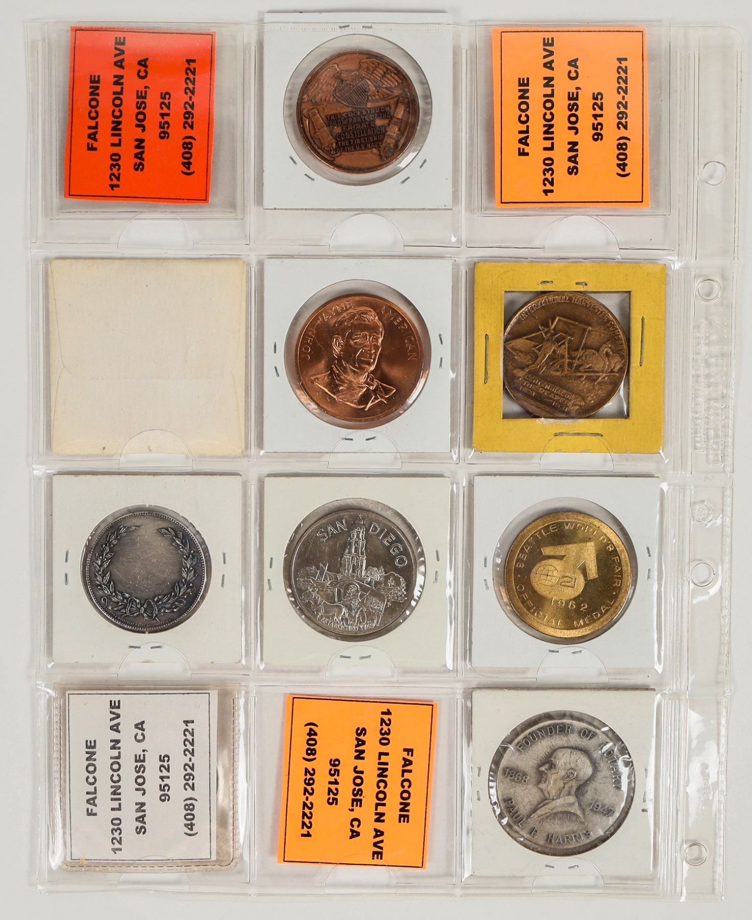 A mixed group of eleven commemorative coins including a brass 1964 Seattle World's Fair, silver 1969 San Diego Centennial, brushed nickel 1938 Tricentennial of Swedes in America, a copper John Wayne coin, a copper Pony Express Centennial coin, and a pendant coin Victory Liberty Loan coin made from German cannons., and others. See photo for design details.