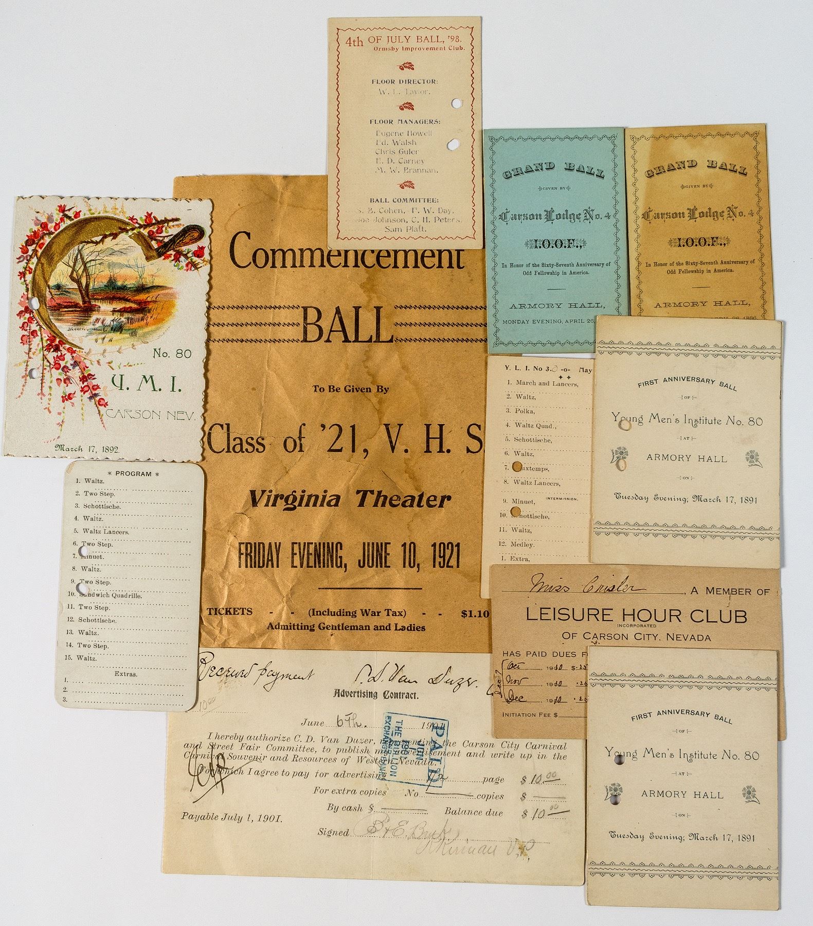 Lot of ten. 1-2) Carson Lodge #4 Grand Ball. Armory Hall. April 26, 1886. One is blue and the other a faded yellow. Dance card inside. 3) March 17, 1892 YMI (Young Men's Institute) Dance. Colorful. 4) Ormsby Improvement Club 1898 Fourth of July Ball. 5) Handwritten Carson High School Nov. 1, 1901 Dance. Dance card is printed. 6-7) Two 1891 Young Men's Institute First Annual Ball. March 17, 1891 at the Armory Hall. One dance card is blank and the other is filled out. 8) Leisure Hour Club Dues. For Miss Crisler. 1910. Signed by Edmund Robinson. 9) Advertising Contract #1 for the 1901 Carson Carnival. Signed by Richard Kirman as Vice President of the Bullion & Exchange Bank. Kirman would become Nevada's 17th GOVERNOR. For $10.00. 10) Commencement Ball announcement of the 1921 Virginia High School class. In the Virginia Theater on June 10, 1921. Rips and creases. State: Nevada City: Carson City HWAC#: 46995 Date: 1886-1921