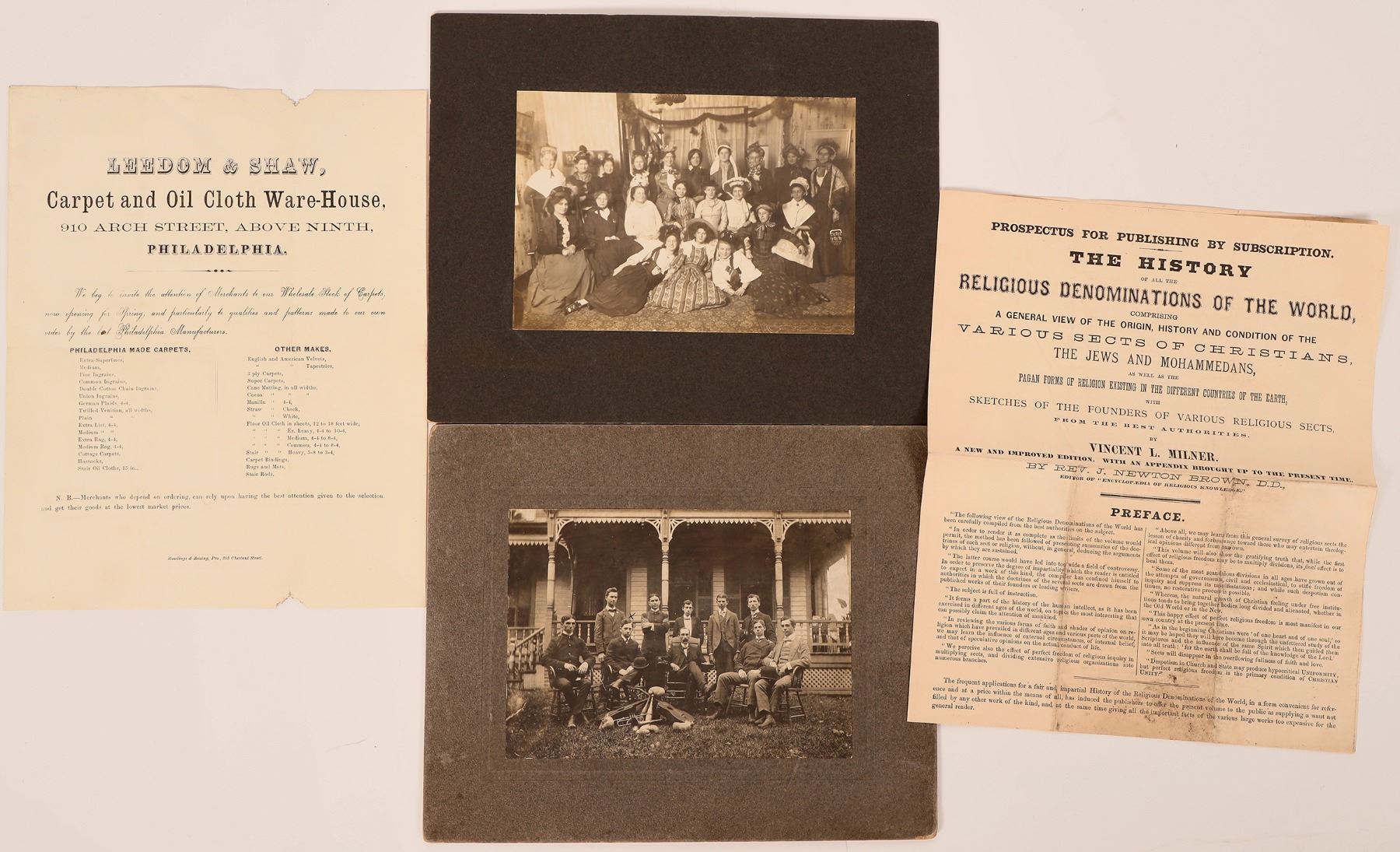 A collection of four pieces of ephemera related to social groups, c1871-1908. Includes: an invitation to merchants to shop for wholesale carpets, Leeds & Shaw, Philadelphia, Penn.; advertisement for book, "The History of all the Religious Denominations of the World," Wm. Garretson & Co., Publishers, c1871; a 6.5" x 4.5" photo of "Girls from Urger's Store," taken at S.S. Urfer's home, New Philadelphia, OH, c1908; & a 6.5" x 4.75" photo of Ganges Band/X-Arthur Samsel, c1901? Both photos are on 10" x 8" mats. Please see photo(s) for more details.[ New Philadelphia Ohio