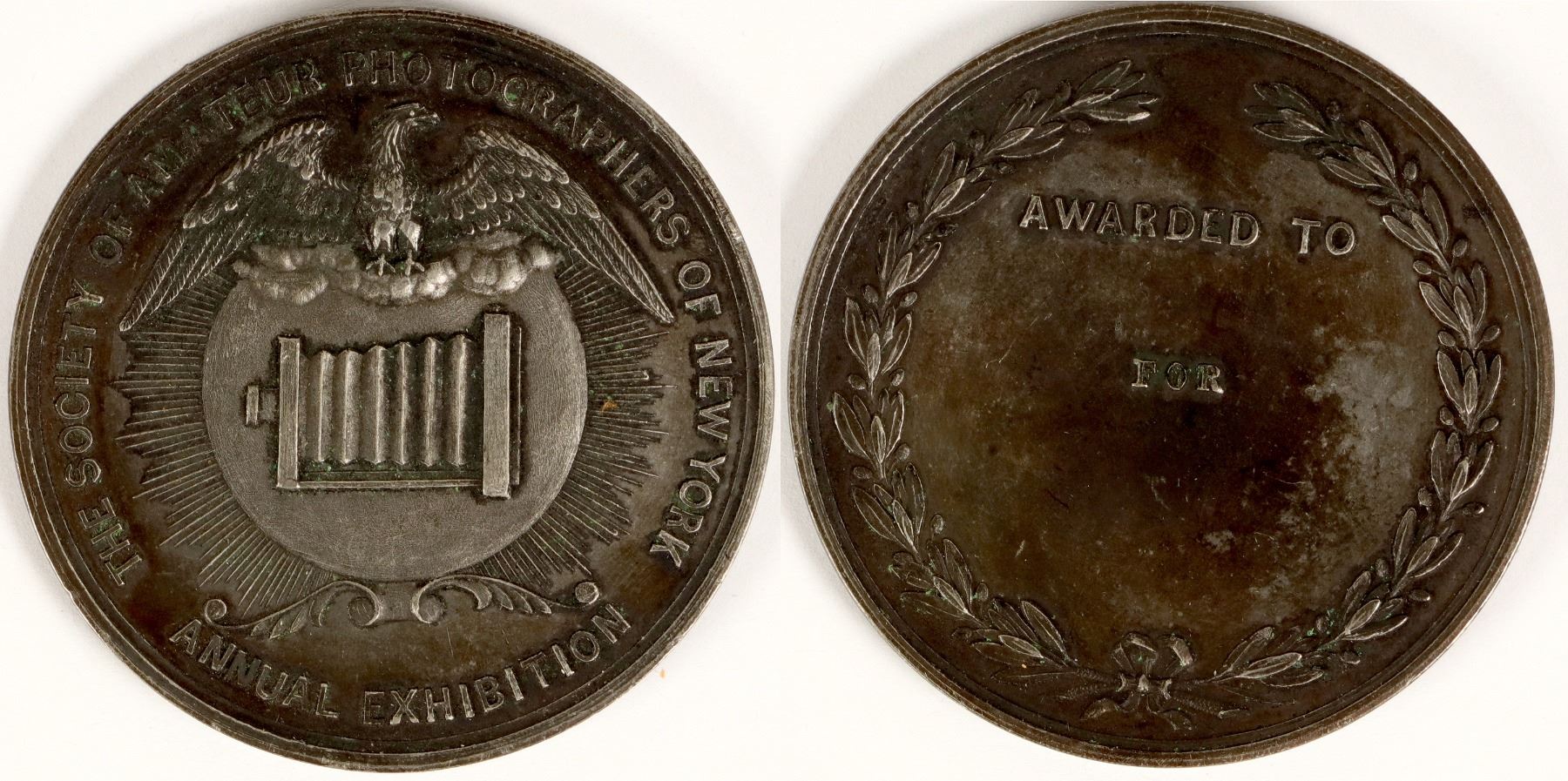 Large (57 mm) silver medal. Obv.: The Society of Amateur Photographers of New York / Annual Exhibition; Rev.: Awarded To / For. One of the first exclusively amateur photography groups in America, The Society of Amateur Photographers of New York came to represent those who saw the medium being weakened and diluted by its newfound popularity with the masses.