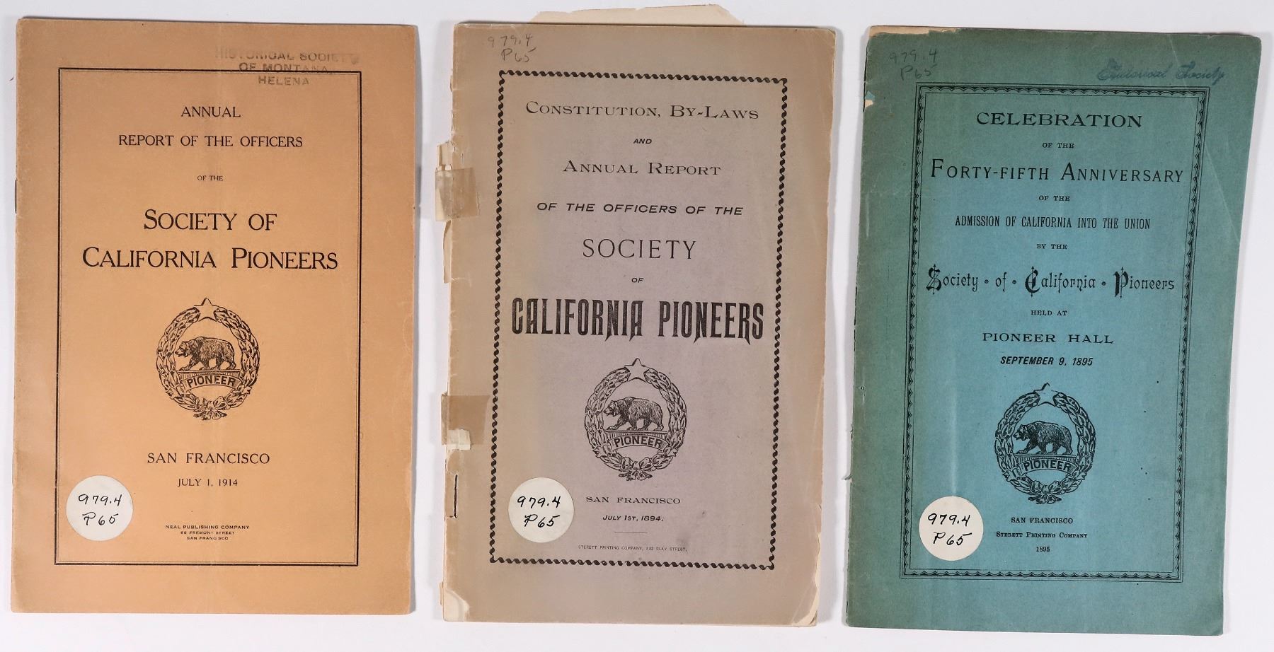 3 booklets from Society of California Pioneers, 1894, 1895, 1914. Speeches, poems, reports etc. 1894 has condition issues, detached back cover etc. Please inspect. California