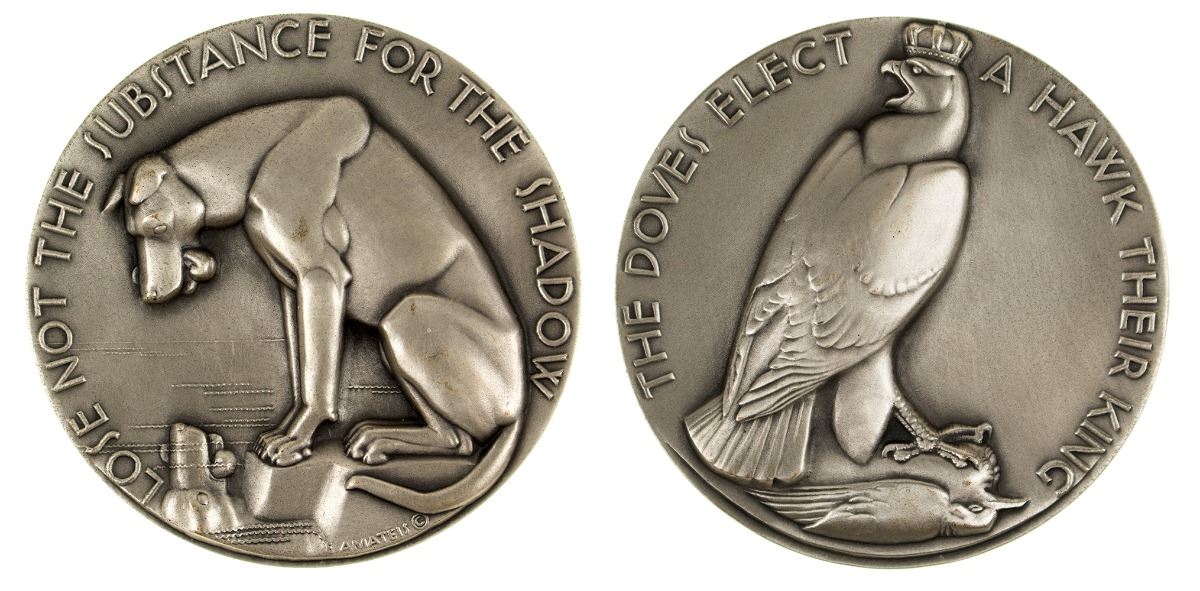 Sculptor: Edmond Amateis. Obv.: Aesop's fable of hawk; Rev.: Dog and reflection. Large silver, Gem BU, in original box with paper. State: City: Date: 1940 FHWAC#: 42945