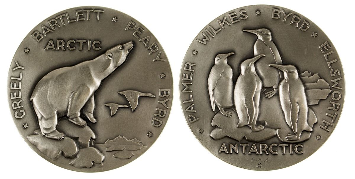 Sculptor: Edwin Springweiler Obv.: Arctic-polar bear; Rev.: Antarctic-penguins. Large silver, Gem BU, in original box with paper. State: City: Date: 1941 FHWAC#: 42948