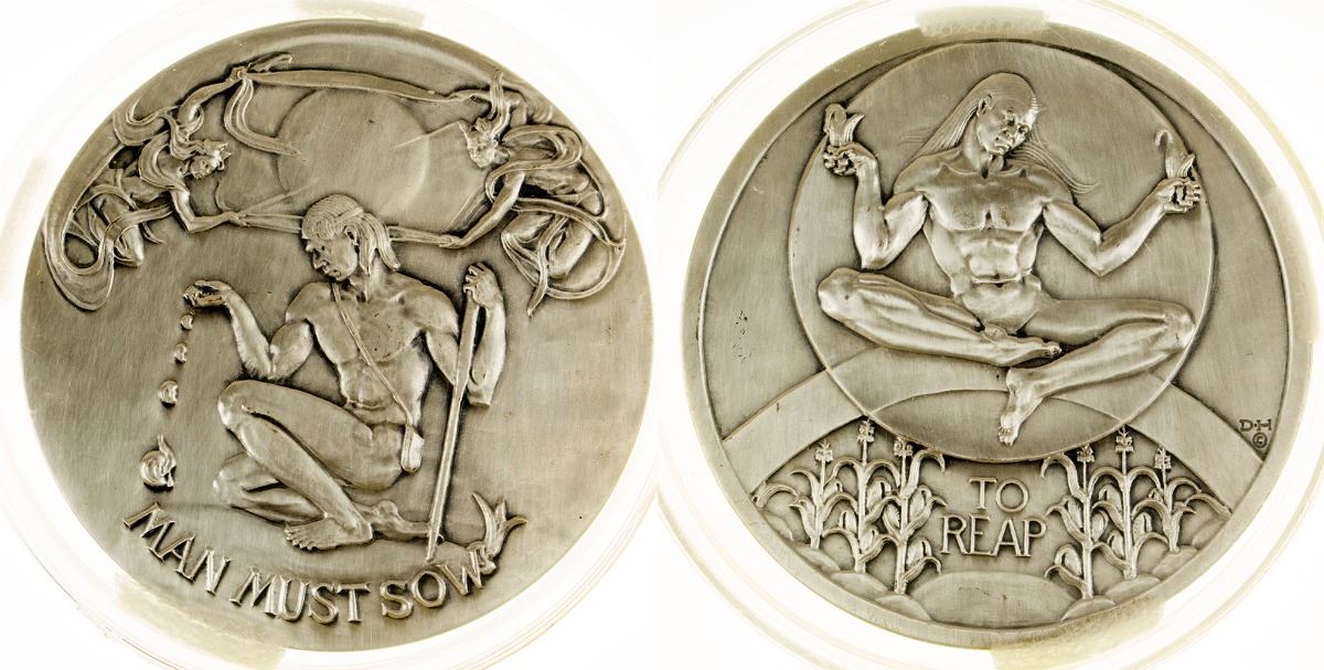 Sculptor: Donal Hord. Obv.: Man must sow; Rev.: To reap. Large silver, Gem BU, no box or papers. State: City: Date: 1950 FHWAC#: 42965
