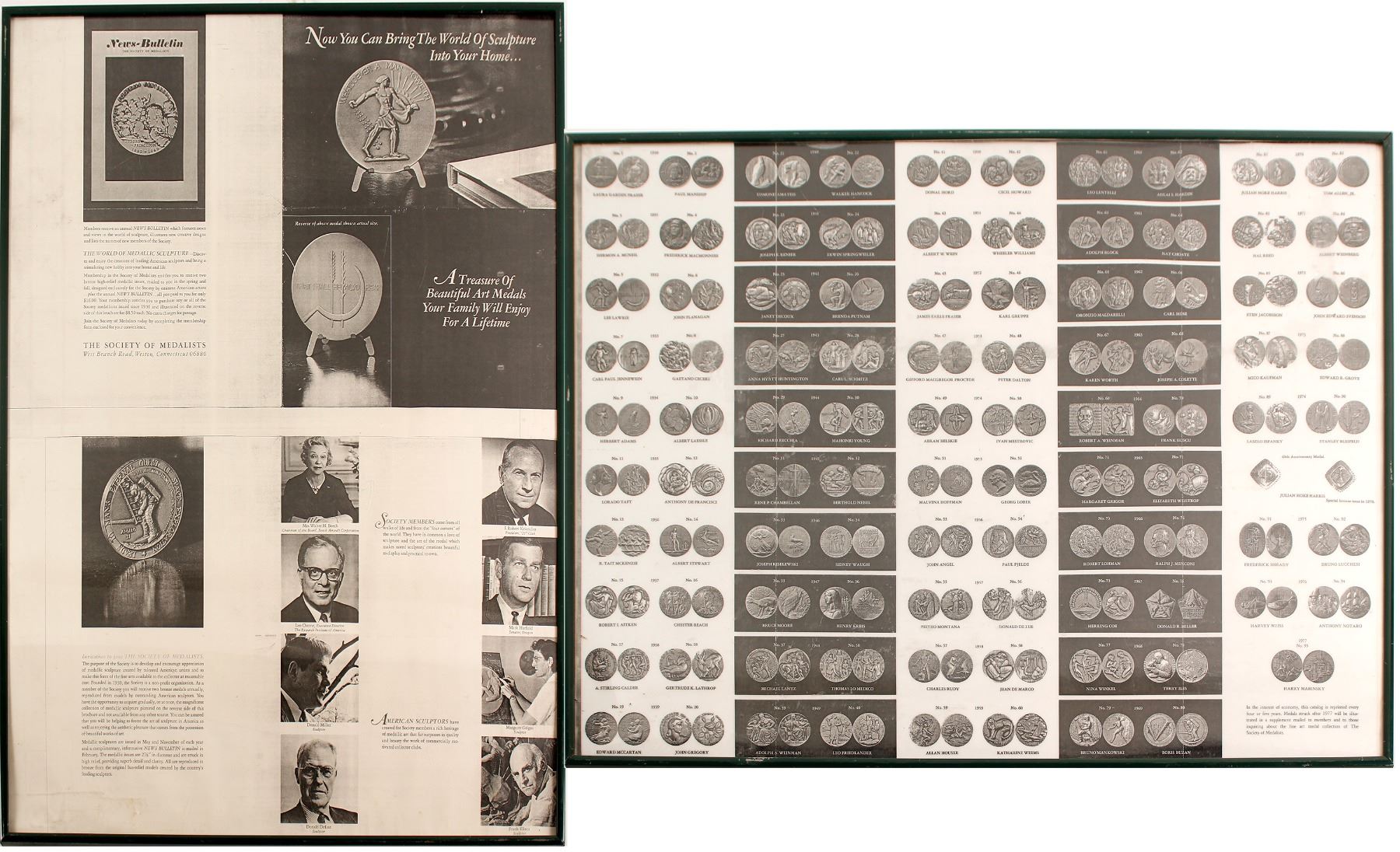 These two frames, each approximately 18x24 inches in size, display copies of promotional information for the Society of Medallists, which was established by Medallic Art Company in 1930 as a subscription series for medallic artwork. Two designs were produced every year using designs by renowned medallic sculptors. One frame is a black and white copy of the catalog of the 95 issues from 1930 to the first half of 1977. The obverse and reverse designs of each issue are shown with the year and the name of the sculptor/designer. The second frame introduces the non-profit Society of Medallists and its mission to "develop and encourage appreciation of medallic sculpture created by talented American artists and to make this form of the fine arts available to the collector at reasonable cost." Each May and November, a new 2 7/8-inch diameter piece was issued to subscribers. This frame also shows eight members of the Society which includes noted sculptors, industry leaders, and Oregon Senator Mark Hatfield. These items are a historical record and catalog of the early days of the Society of Medallists and were part of unsold material that remained after the liquidation of Northwest Territorial Mint.