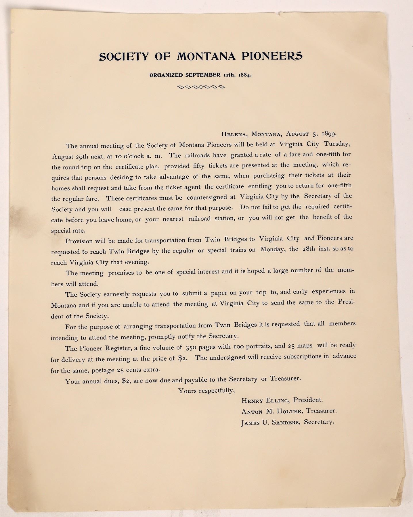 1899 Society of Montana Pioneers notice of annual meeting. Creases, staple holes, dogears. Please inspect. Montana