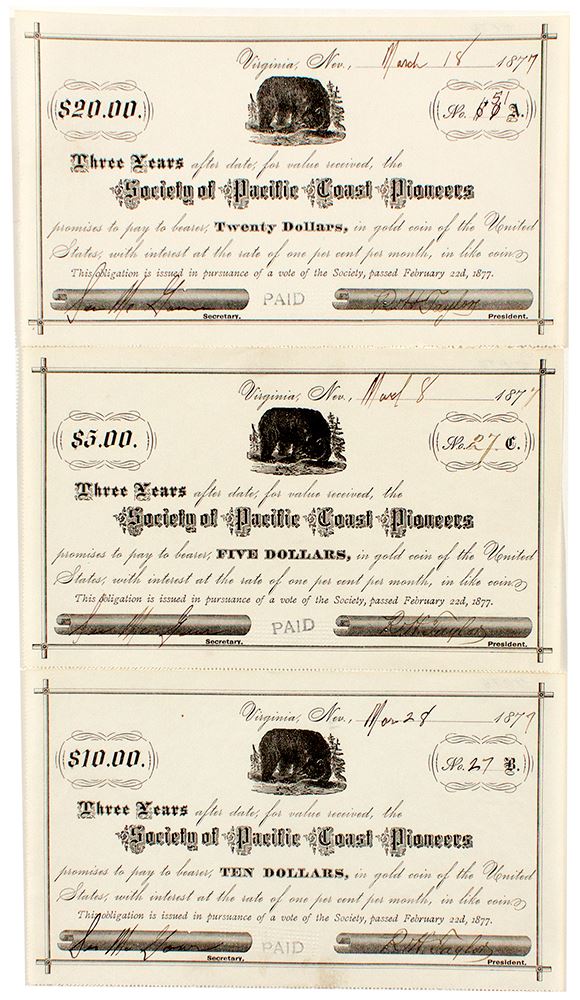 $5, $10, and $20 denomination certificates. All with the Virginia, Nev. dateline and issued in Match 1877. Bear vignette. All three stamped Paid. 5" x 8.25" All three in very good condition.