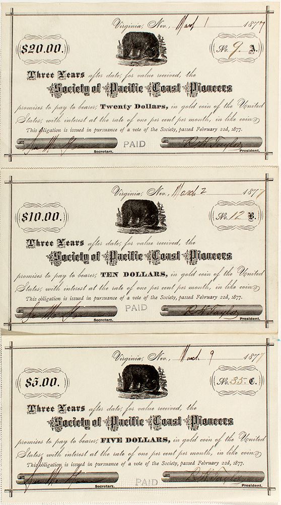 Second group of these rare Comstock bonds: $5, $10, and $20. Issued March 1877. Very good condition. Please see previous lot for historical background. 5" x 8.5"