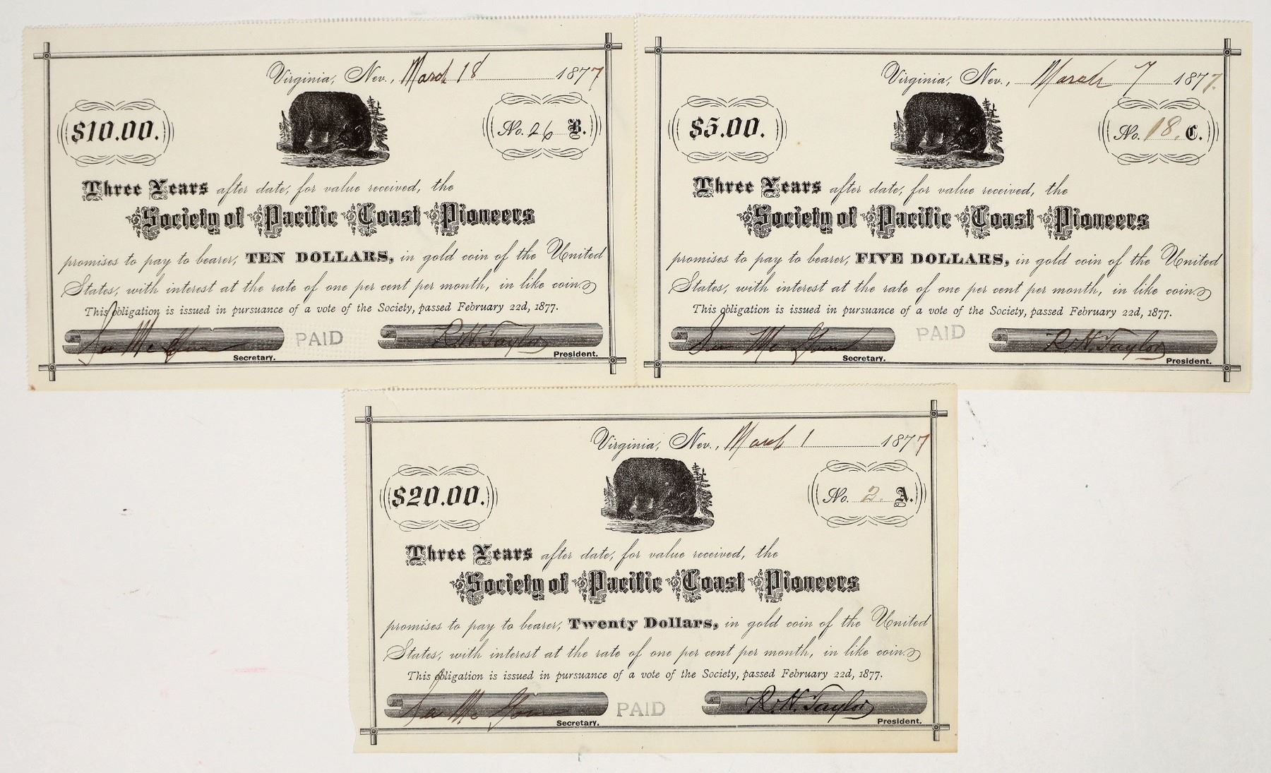 Complete group of the three issued denominations: $5, $10, and $20. All with bear vignette, signed by president RH Taylor and the secretary. 5 x 8" Issued to raise funds to rebuild their headquarters which burned in the great fire of 1875.