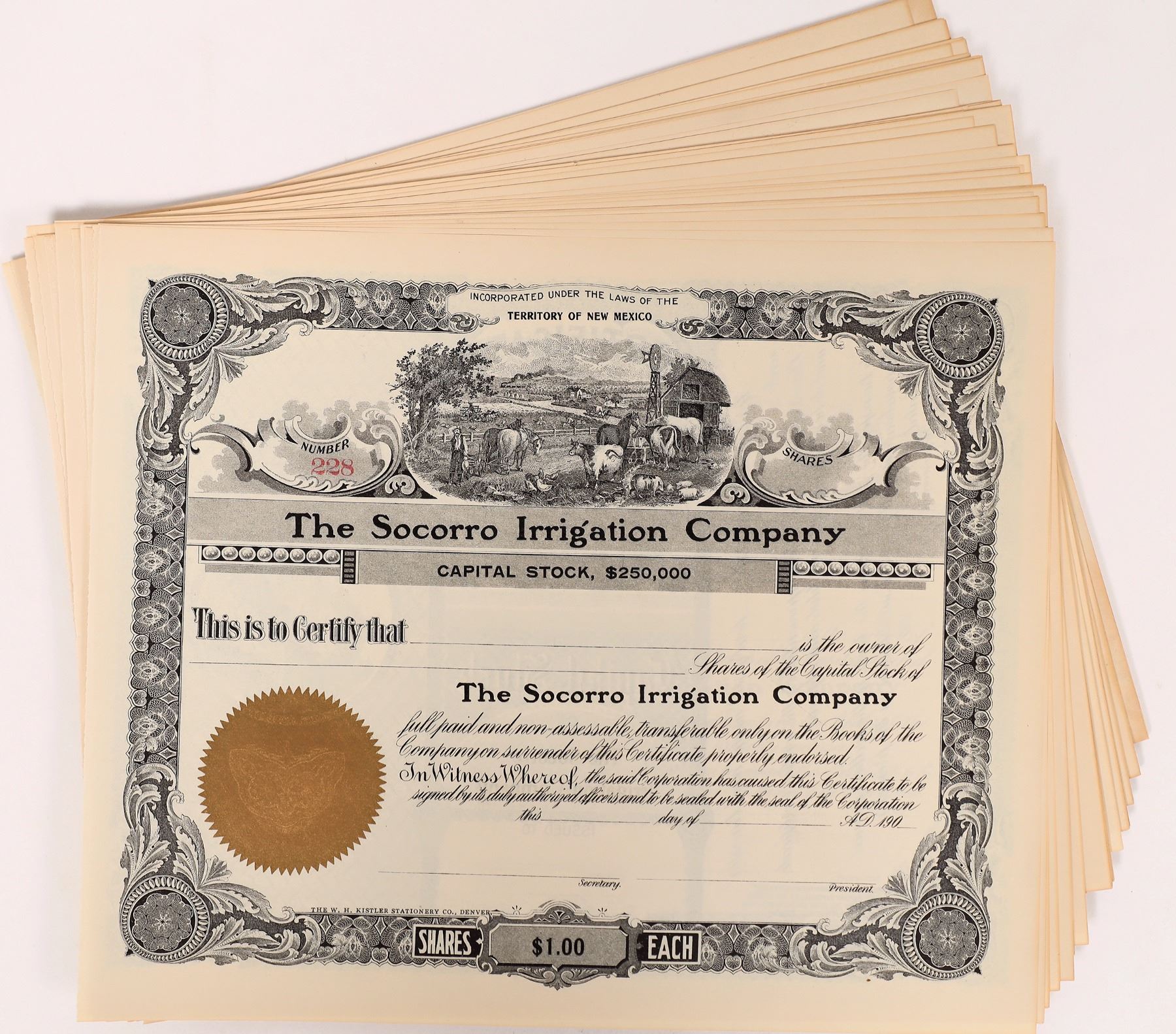 Lot of approx. 75 unissued stock certificates from the 190- period. Inc. in the Territory of New Mexico. Black border and print, gold seal, and farming vignette. Printed by WH Kistler Stationery Co., Denver.