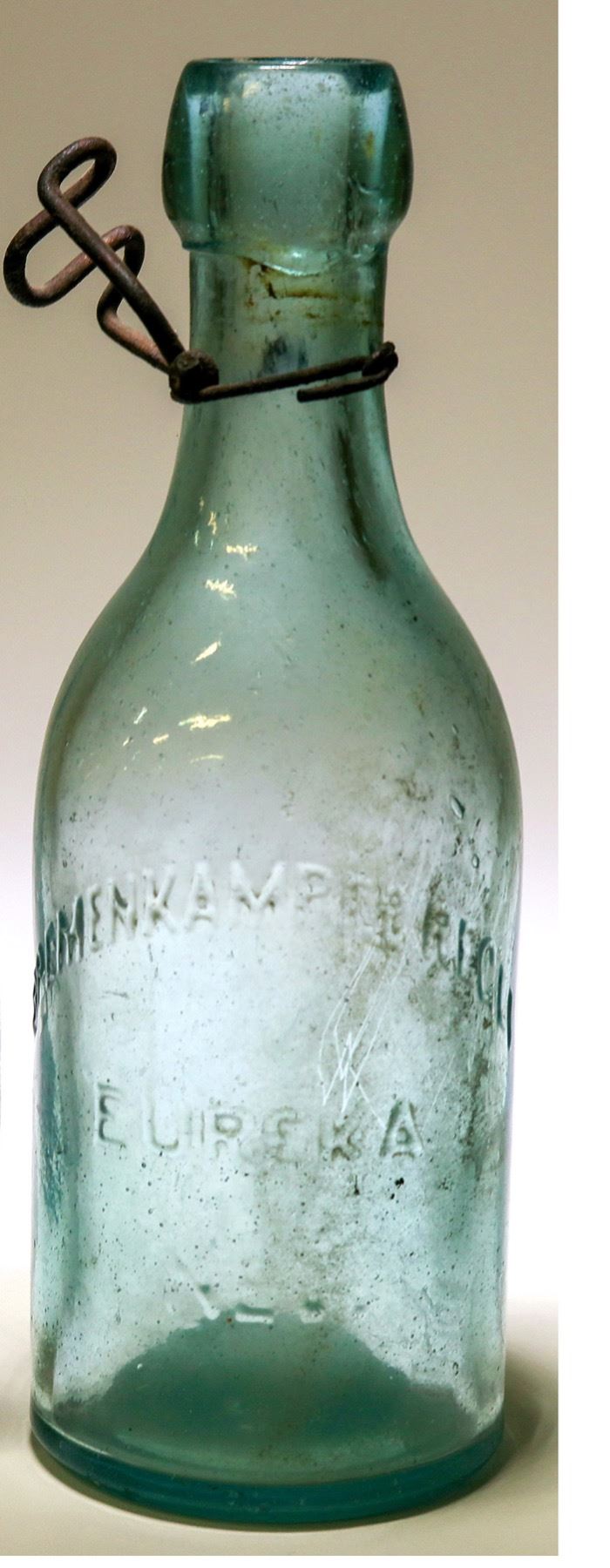 Bremenkampf & Regli (cu) / Eureka // Aqua , western blob top soda bottle. 7 3/8" tall, applied top with original wire closure. Nice texture on the glass. Never been buried , but has a bit of haze, that should wash out. Two 1 /16" pinheads on the base, other wise perfect.. Nice bottle, out of the west !! ( RH).