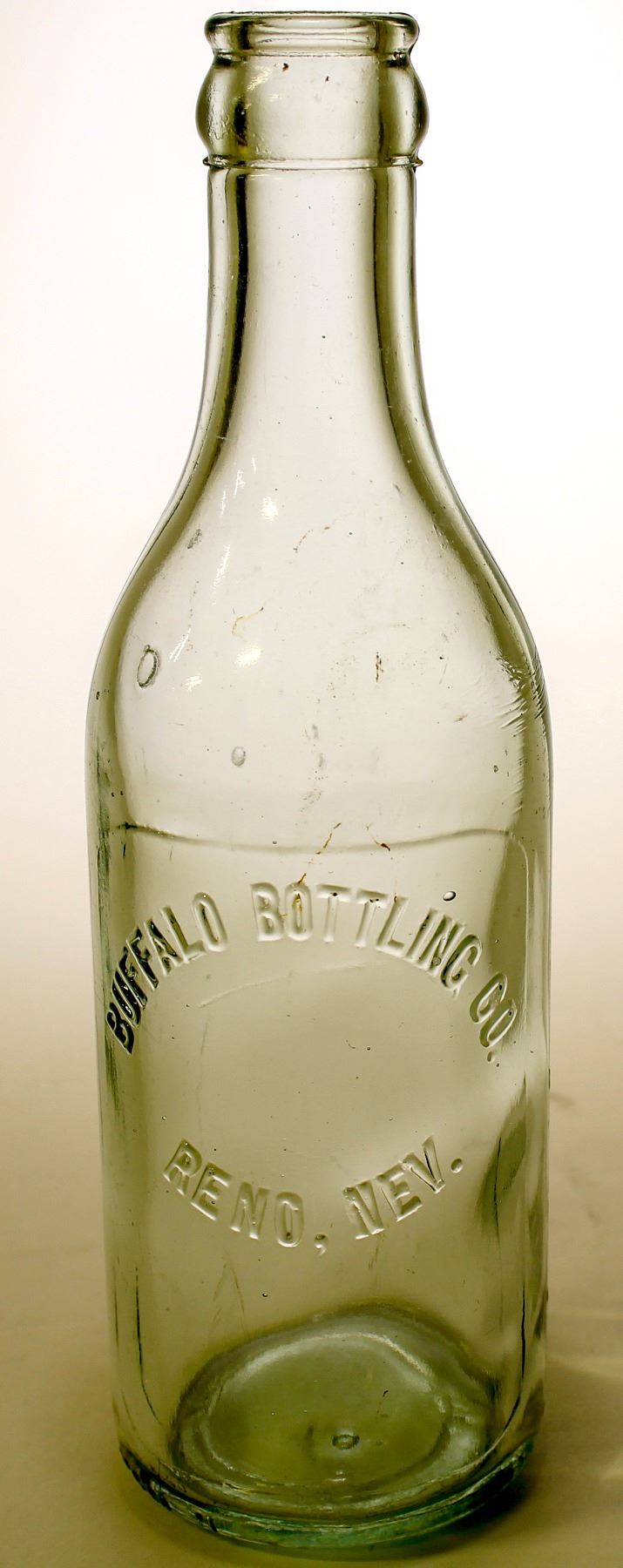 Embossed in a upright, rectangular slug plate is: Buffalo Bottling Co ( au ) / Reno, NV // Aqua, 7 3/4" tall, early crown top, ABM lip. Super mint , perfect like a brand new bottle. Nice looking, and well balanced design.Fairly scare item. ( RH).