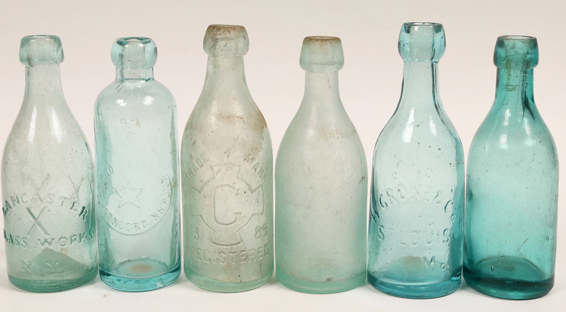 Six aqua soda bottles. Crone & Co./ St Louis, a beauty, professionally cleaned; Concord Bottling Co./ Concord, N.H. star in center. circular slug plate, Hutch (the latter two near to mint) ; Lancaster/ X/ Glass Works/ NY//XX stain; W. Gubner's Sons/ New York, heavy stain; two no-name aqua blob sodas.