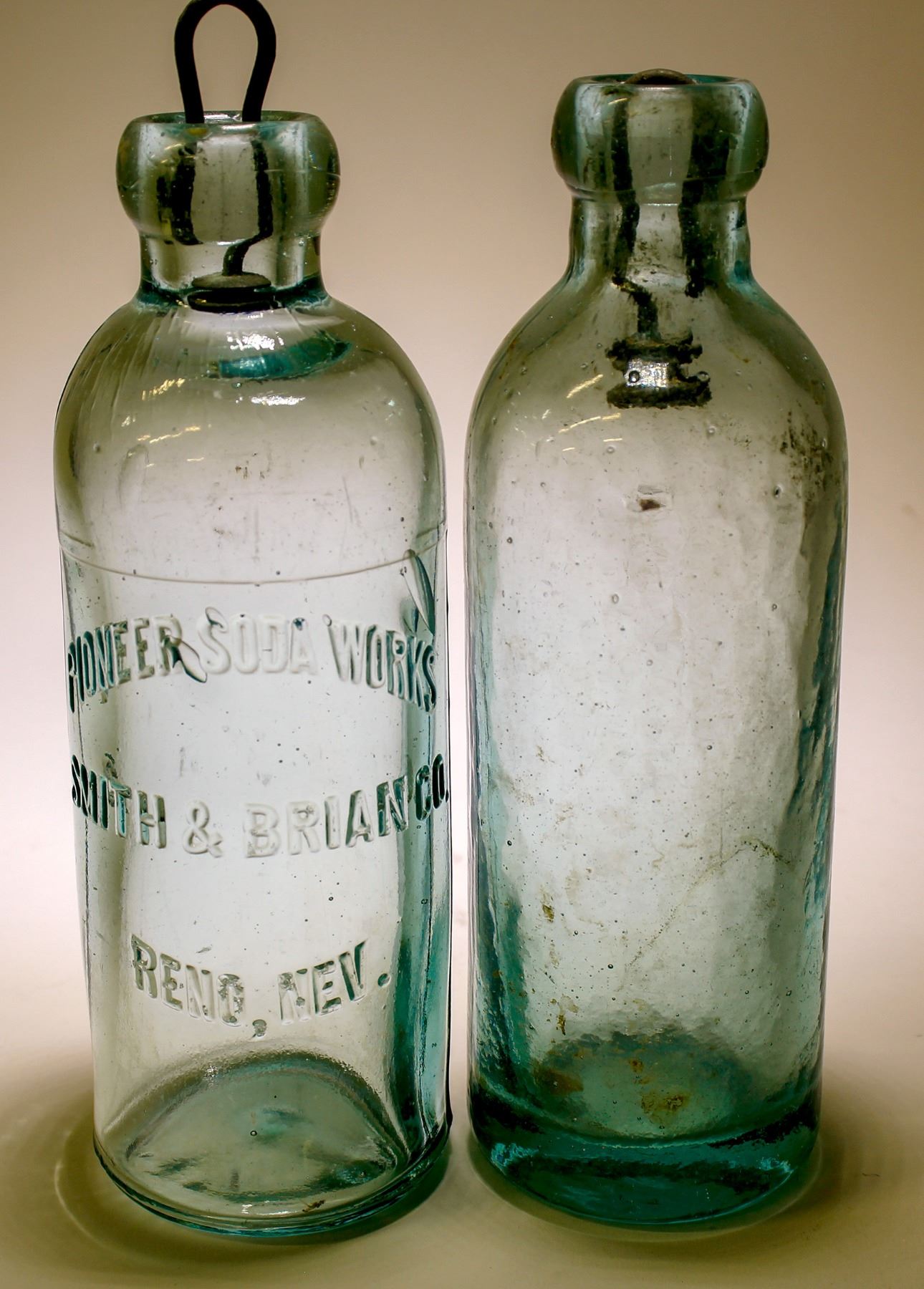 Item # 1 of 2 : Pioneer Soda Works ( cu )/ Smith & Brian Co. / Reno, Nev ( ad ) // Pale aqua, Hutchinson style soda bottle. 7" tall, squat top, tooled lip, four piece mold, and original wire stopper. Two nice bubbles in this specimen. One, right over " Works" , on the front of the bottle. Great specimen .Item #2 of 2: Unembossed, Hutchinson soda bottle. 7 1/8" tall, squat top, tooled lip. Perfect , like a brand new bottle, and hammer whittled. Also, very rare to see this type of bottle...unembossed !! Great pair of sodas !! ( RH )Fred Holabird Collection
