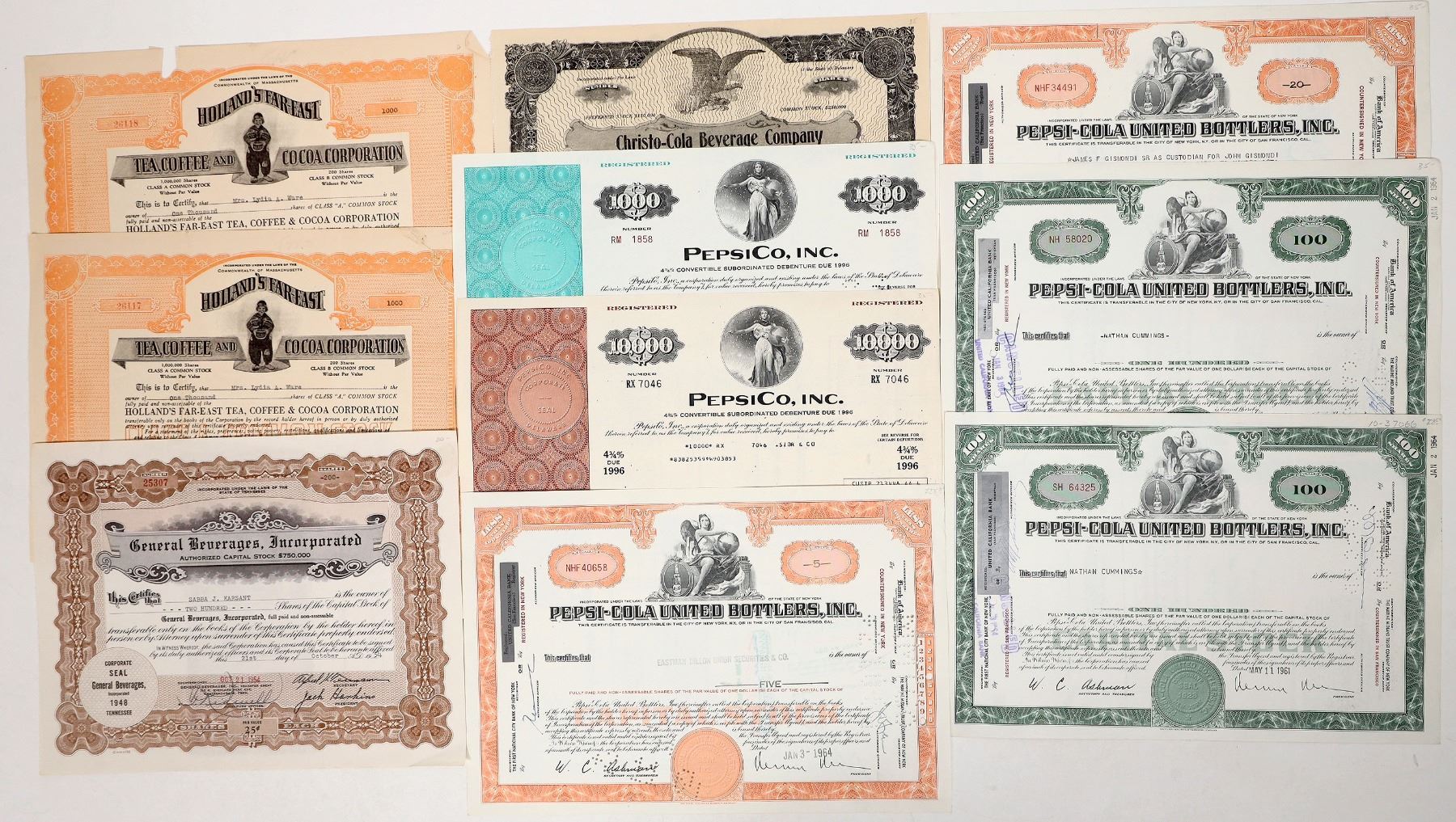 A group of 10 stock certificates, dating 1917-1977, from four different soda/beverage companies: the Christo-Cola Beverage Company (1); General Beverages, Inc. (1); Holland's Far-East Tea, Coffee, and Cocoa Corporation (2); Pepsi-Cola United Bottlers, Inc. (4); and PepsiCo, Inc. (2). All certificates have the signatures of secretary and president of their respective company and each bears a company seal. All Pepsi-Cola United Bottlers certificates are cancelled with hole punch cancellations. The Holland's Far-East certificates have some significant tearing; all others are in good condition.
