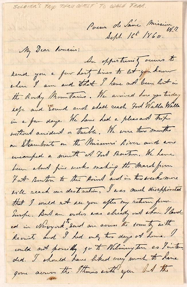 Datelined Couer d Lane (sic), W. T. September 16, 1860. Three pages. Small size. "We should reach Fort Walla Walla in a few days." "We were two months on steamboats on the missouri RIver." "...encamped a month at Fort Benton." "We have been about five weeks making the march from Fort Benton to this point...." His final post will be Fort Chehalis, Grays' Harbor, Washington Territory. He had just returned from Europe and already had his orders to proceed to Walla Walla. (The Couer d'Alene Mission is in Northern Idaho and house the oldest building in the state.) Potter Collection Date: 1860 Location: Couer d'Alene, Washington HWAC# 59940