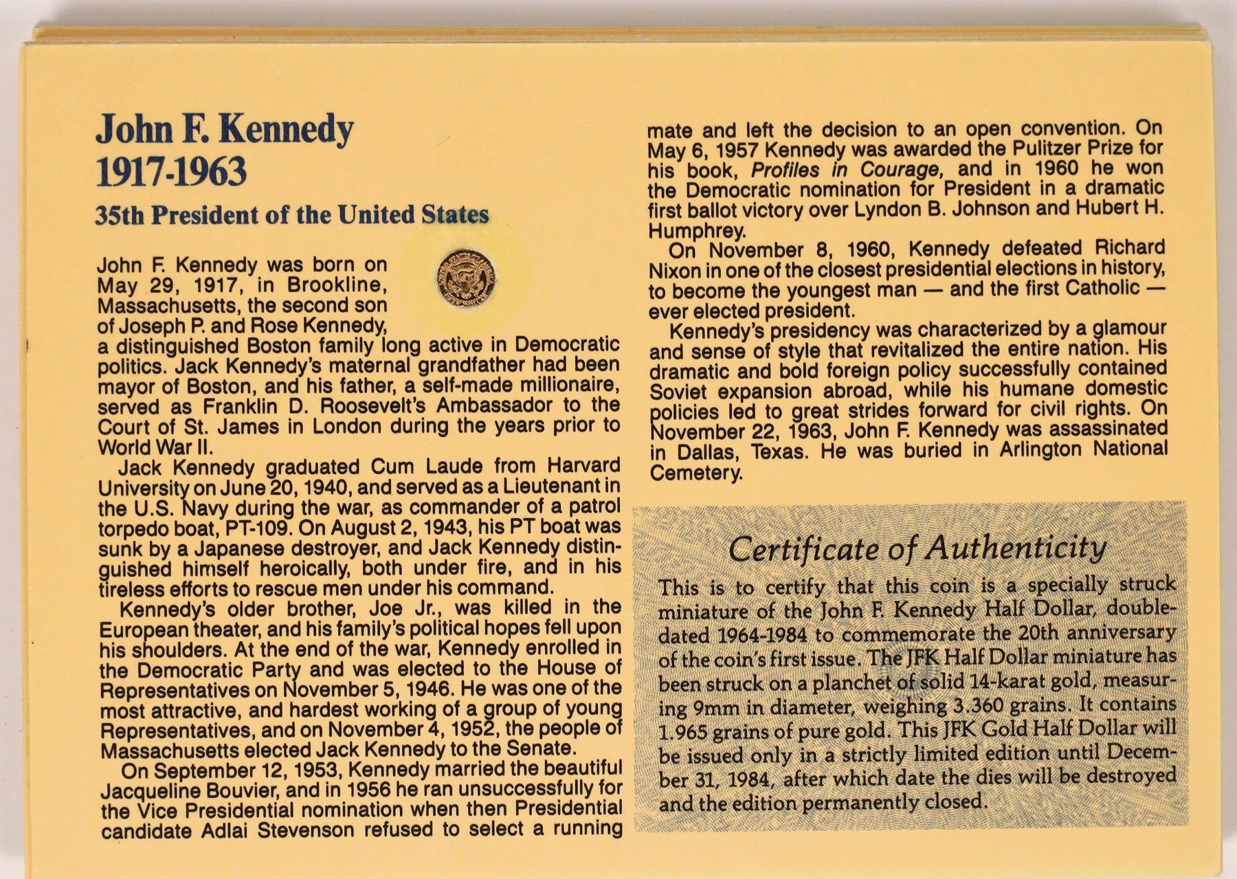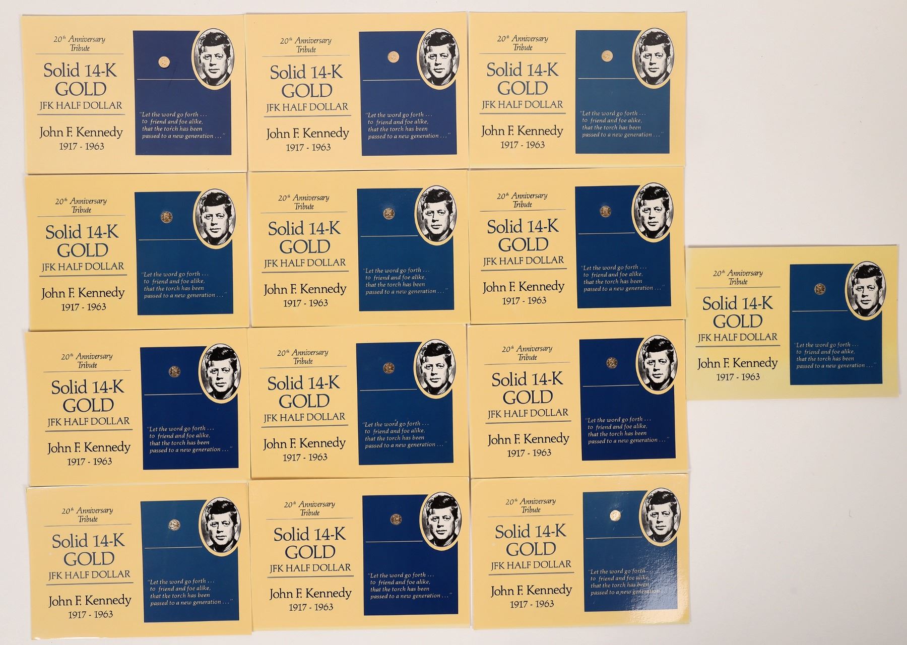 Lot of 13 JFK half dollar miniatures on original brochure cards. The card has a biography of JFK and his portrait. Struck on a planchet of solid 14 karat gold, measuring 9 mm in diameter, weighing 3.360 grains. Each contains 1.965 grains of pure gold (0.004 oz. AGW). Issued on the 20th anniversary of Kennedy's death.