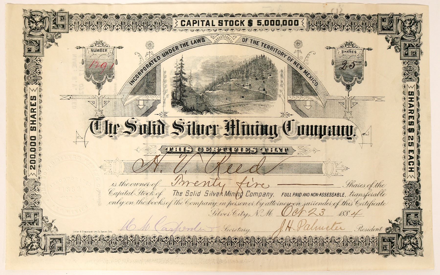 # 1291 for 25 shares to HV Reed. Signed by Carpenter and president JH Palmeter. Dateline 1884 Silver City. Incorporated 1882. Not cancelled. Beautiful arched vignette. Collier & Cleveland printer (Denver). A few pinholes. No edge or corner issues. "The Solid Silver Mining Company has eight patented claims; the principal location of the group, and the one on which the most development has been done, is the Black Hawk. The records of the company shovy that the mine has produced nearly $600,000 in silver; one car load of the ore is said to have brought almost $28,000. About 750 feet of work constitute the development: the character of the formation is much the same as at the Alhambra. [New Mexico mines and minerals by Jones] Ken Prag Collection