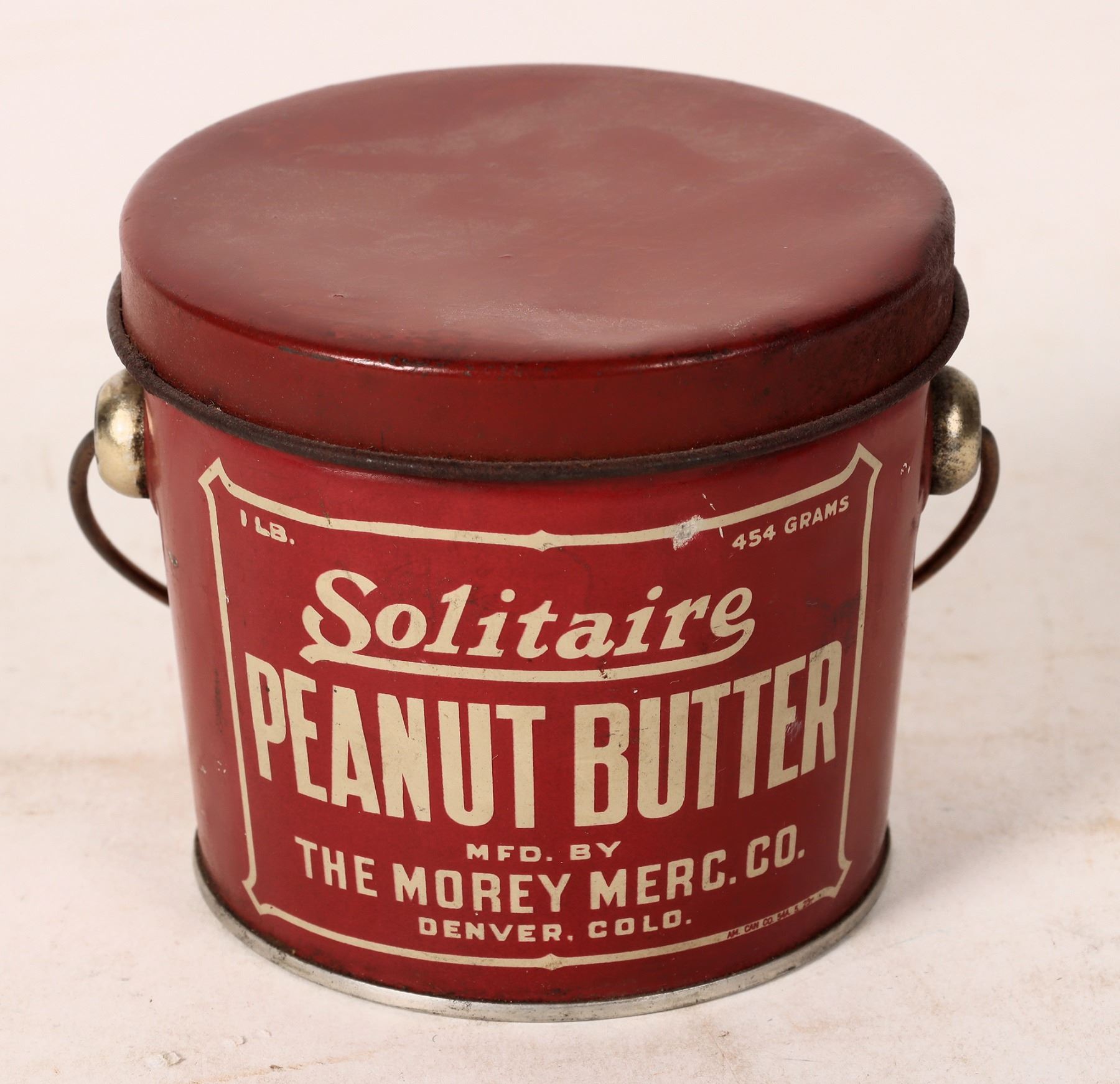 Red mini peanut butter tin, manufactured by The Morey Merc. Co. of Denver Colorado: one pound tine with top and handle. 4 inches in diameter, 3 1/2 inches tall. Circa 1900s. Colorado Danver
