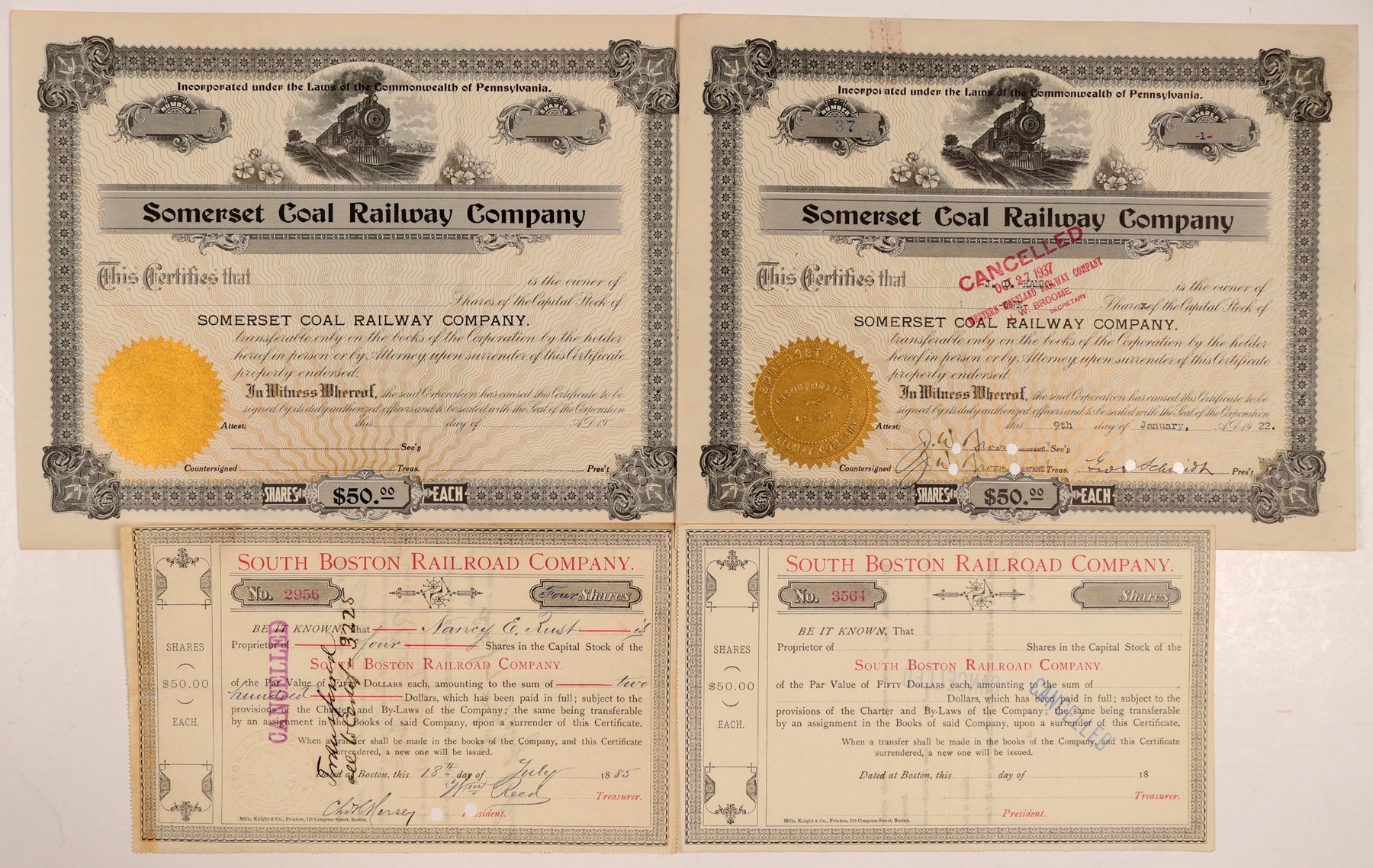 Also included U/U, completely blank $50 par stock certificate in AU cond./ Ken Prag Collection