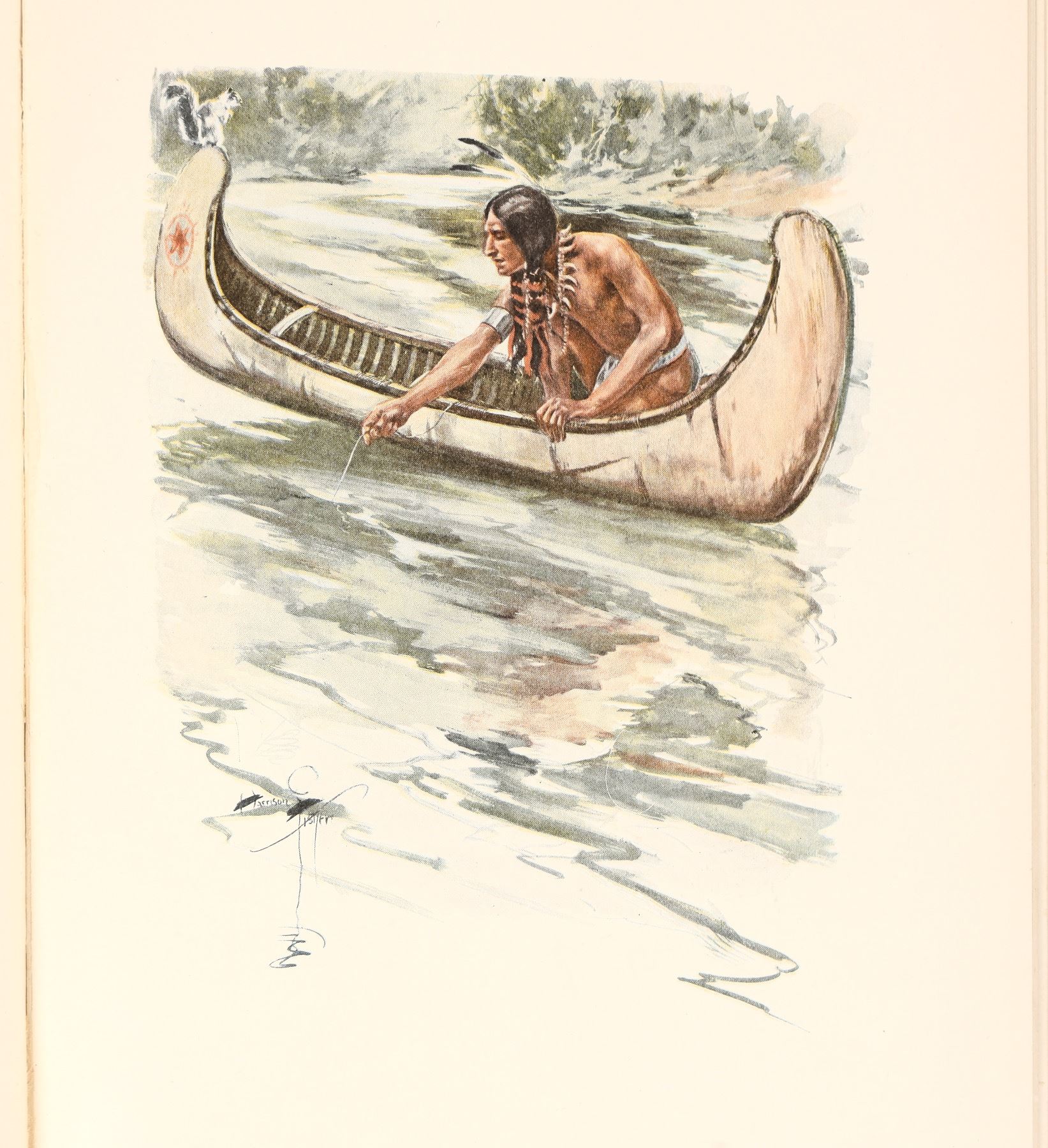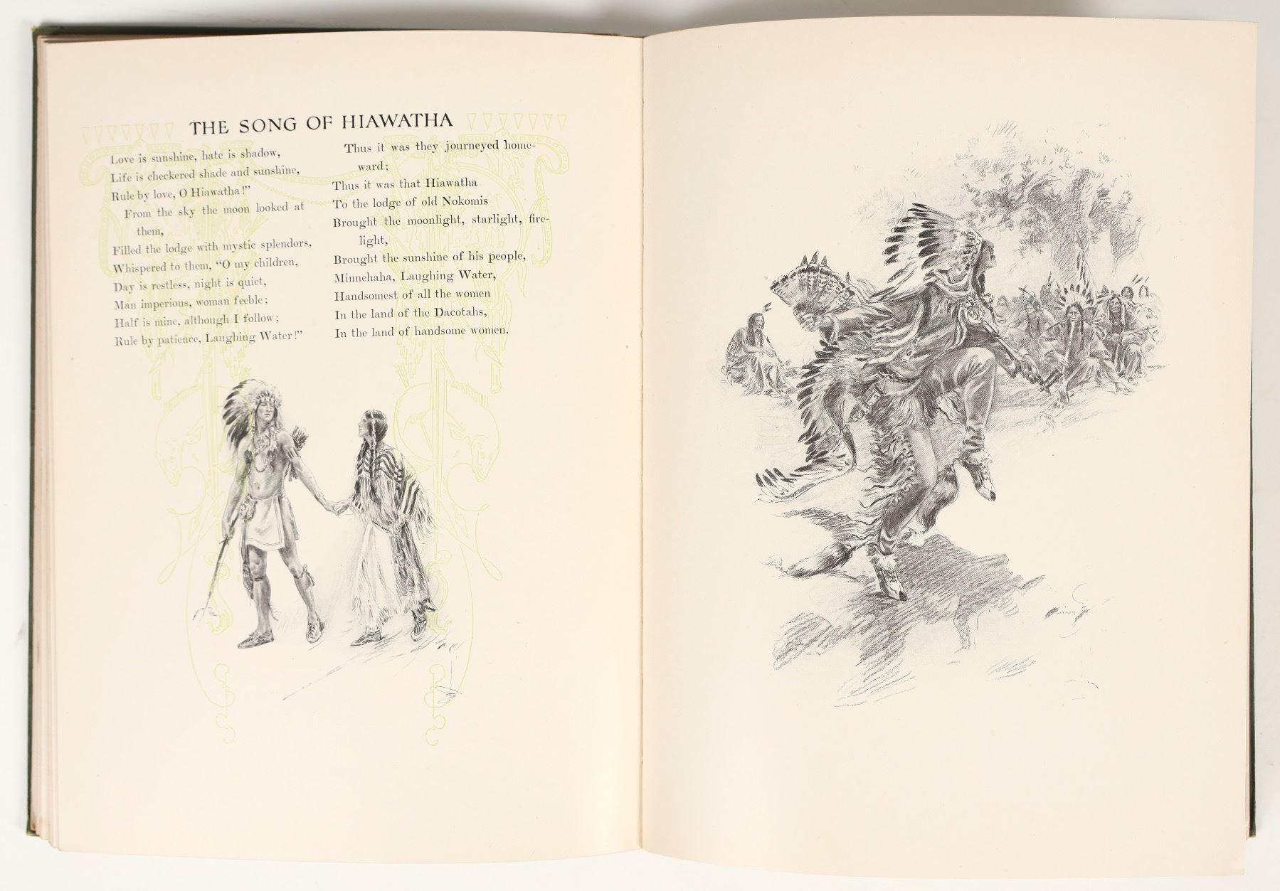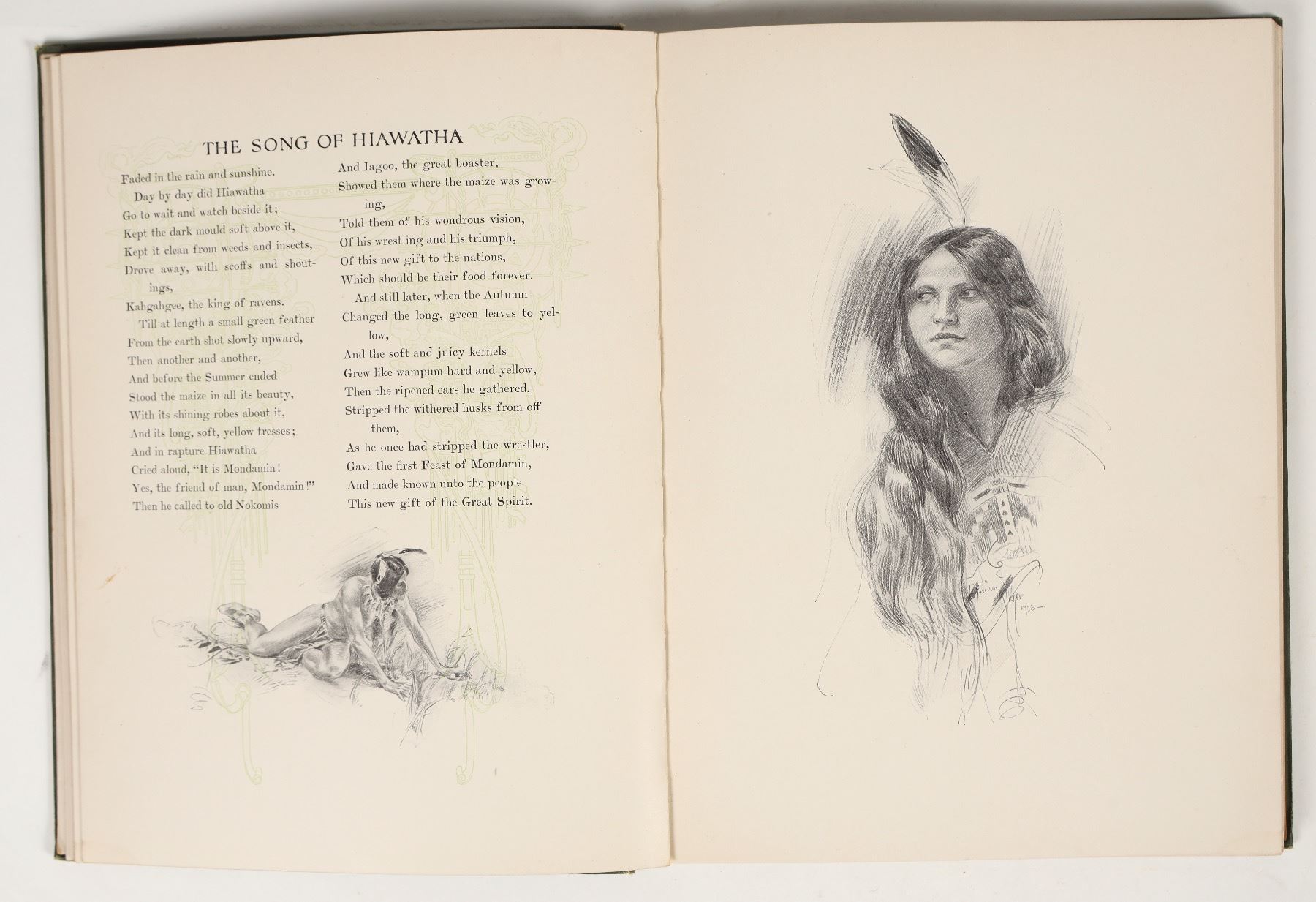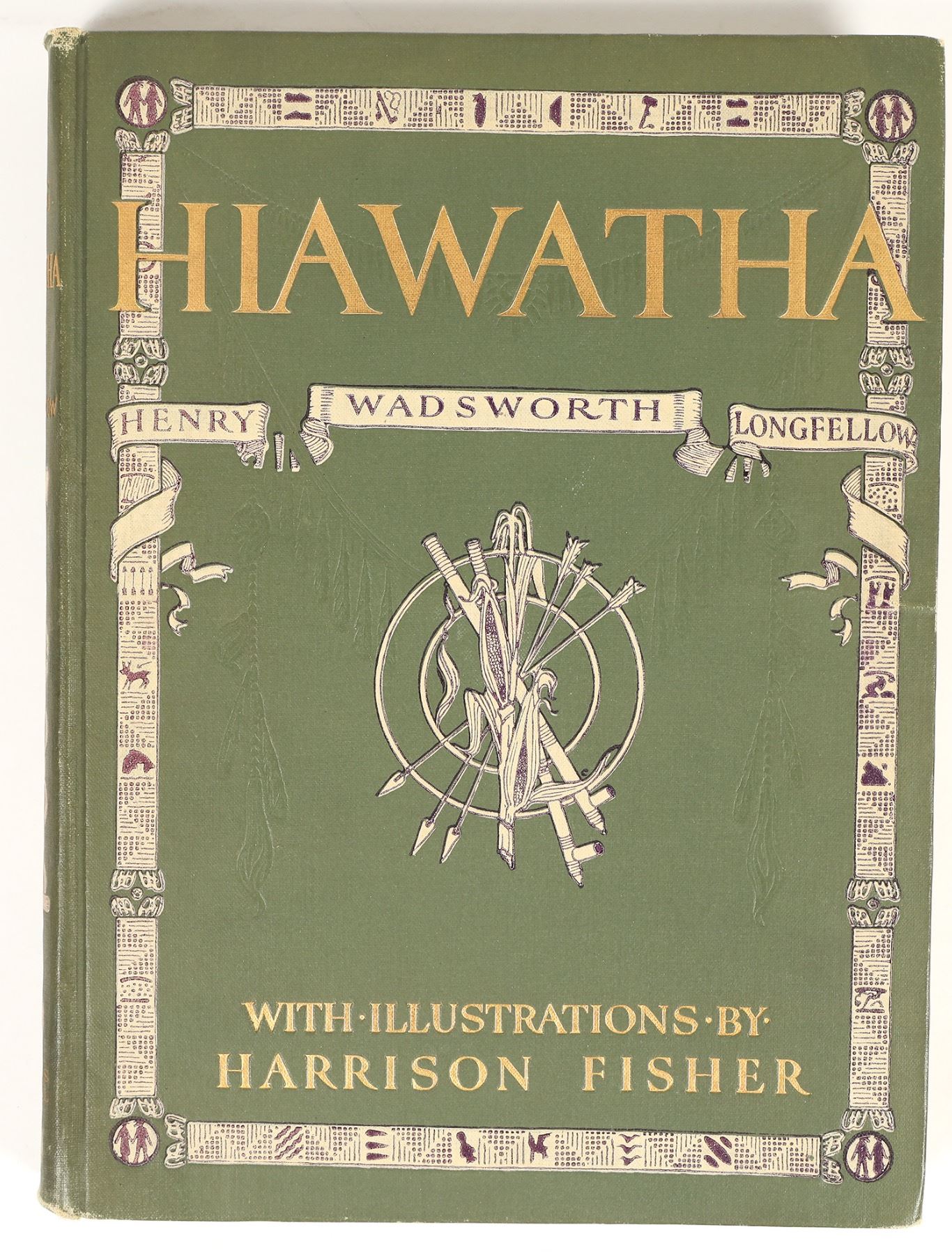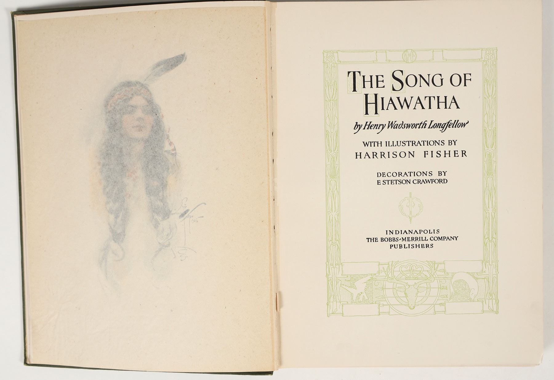 A 1910 copy of Henry Wadsworth Longfellow's epic poem 'The Song of Hiawatha' featuring gorgeous illustrations by Harrison Fisher, a renowned American illustrator. The poem follows the heroic exploits of Hiawatha, a fictional Ojibwe warrior, and his tragic romance with a Dakota woman. Dozens of Fisher's illustrations are placed throughout the book, including a few pieces in color. His style is striking, with a masterful balance between realism and dynamic motion; see photos. Hardbound in green leather w/ gilt lettering, good condition with some minor cosmetic wear to cover.
