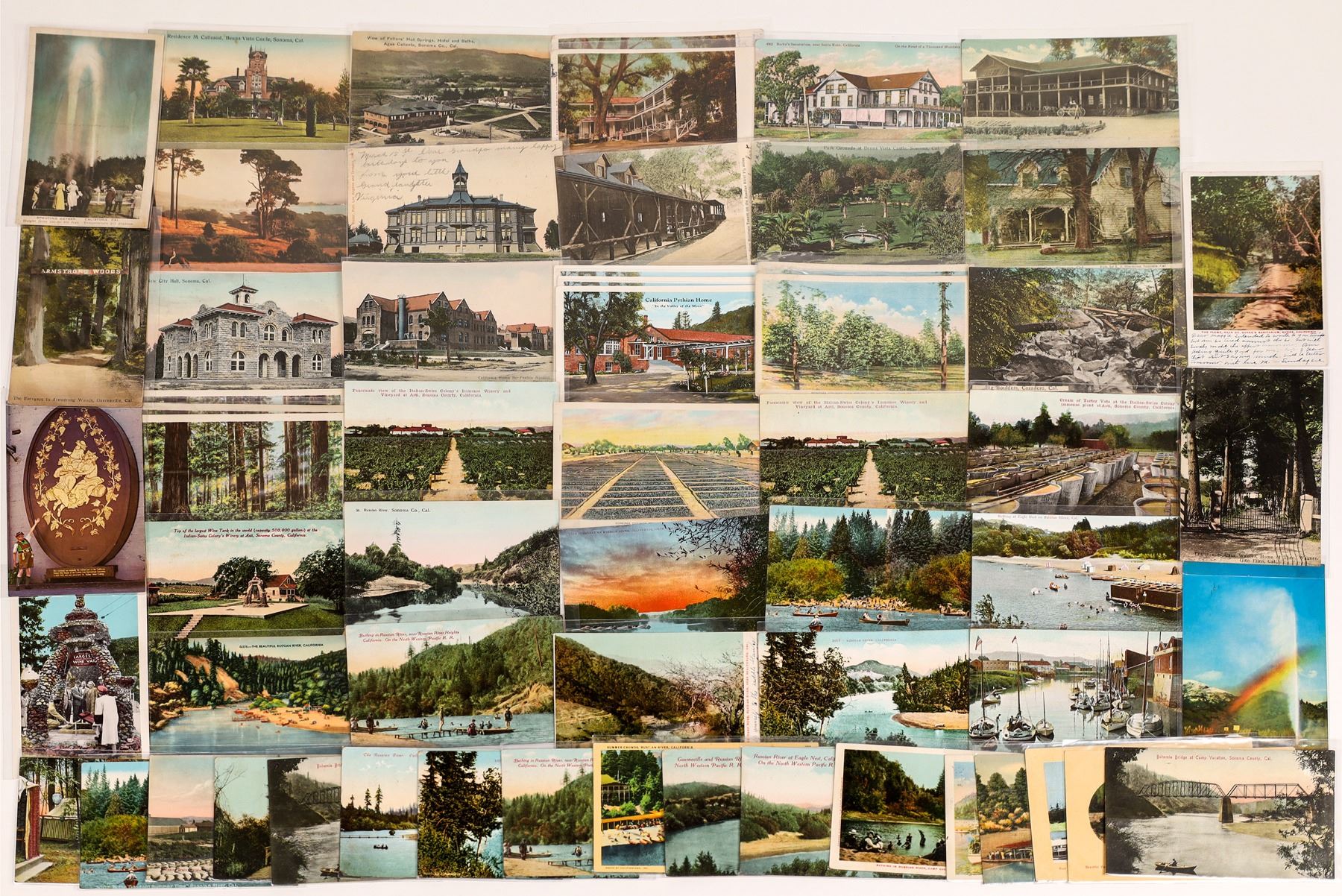 A variety of color postcards with scenes of Sonoma County, California, including multiple recreational locations along the Russian River; some of the vineyards and wineries in the area; The Boulders of Cazadero and the Armstrong Woods of Guerneville; the Old Faithful Geyser of Calistoga; the California Home for the Feeble Minded in Eldridge; the California Pythian Home near Santa Rosa; residence of General Vallejo; the [then] New City Hall; Fitch Mountain Tavern; Petaluma High School; Burke's Sanatorium near Santa Rosa; the Club House at McCray's; Fetter's Hot Springs; and Buena Vista Castle.
