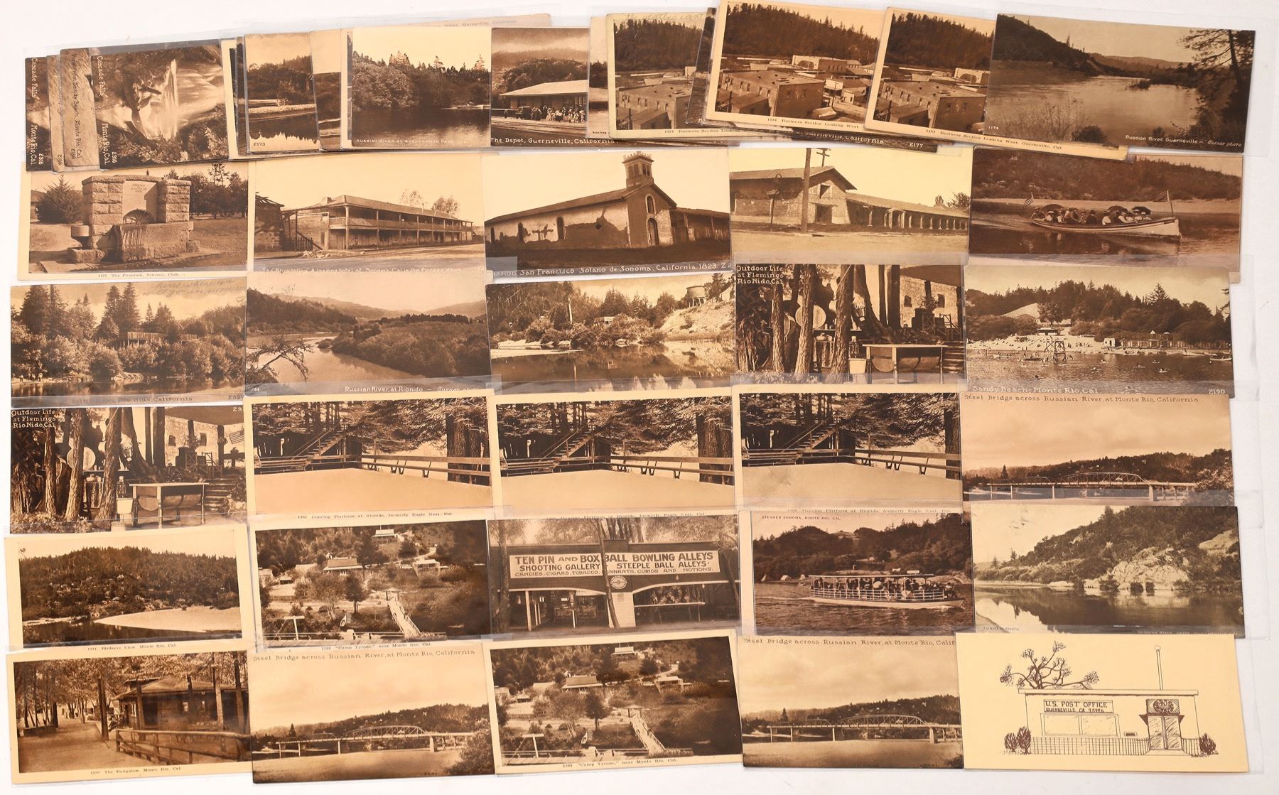 Group of amber cards from Sonoma County includes 18 from Guerneville, 15 from Monte Rio, 8 from Rio Nido and 4 from Sonoma. Town views and scenes along the Russian River are here. State:California City:Sonoma County Date: Provenance: Ken Prag Collection