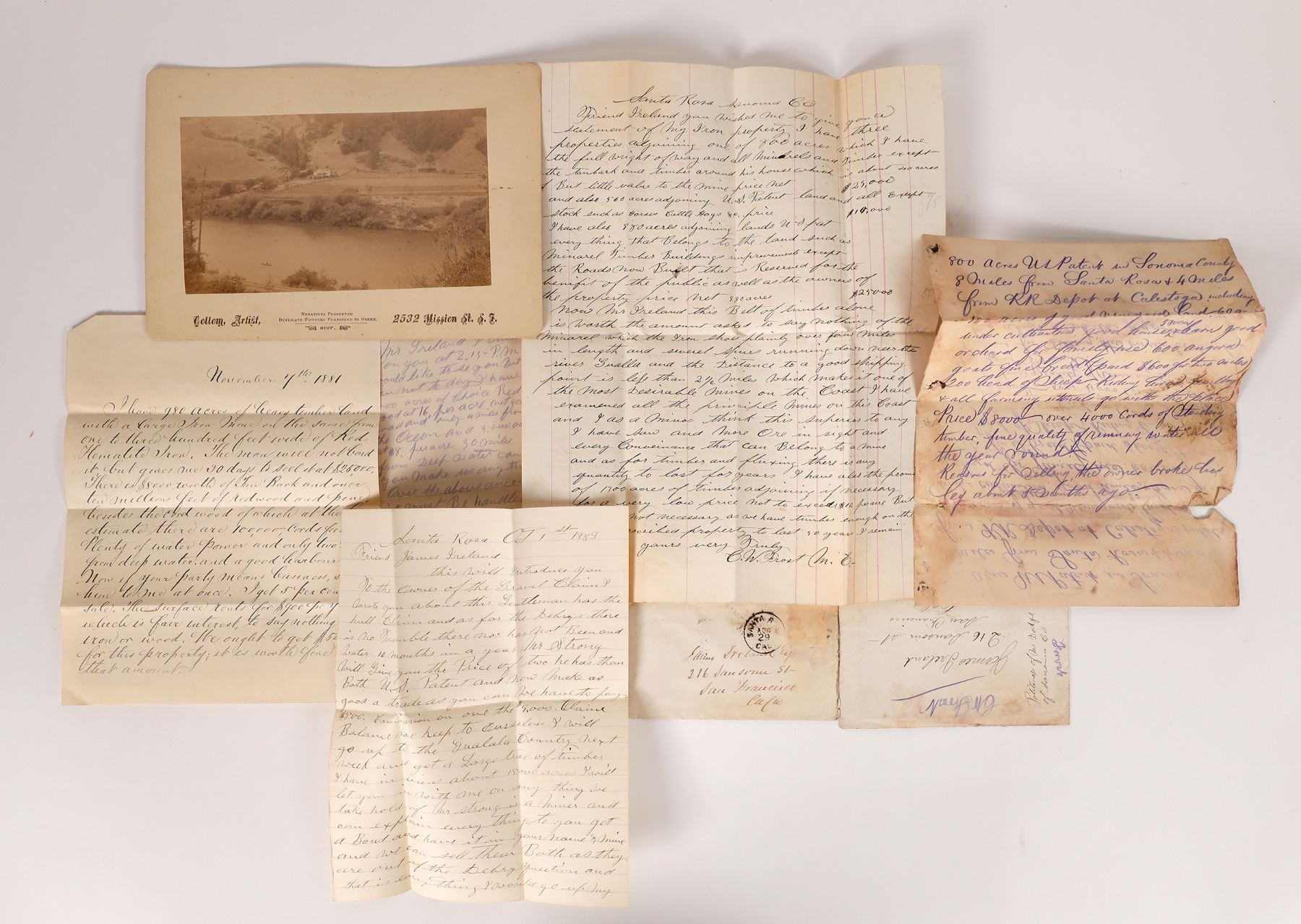 8 pieces of late 19th century Sonoma County ephemera. 2 covers with contents, no stamps. 5 letters related to land in Sonoma, 1910 photo of Russian River by Collom, San Francisco 4.75x7.75". Sonoma County California