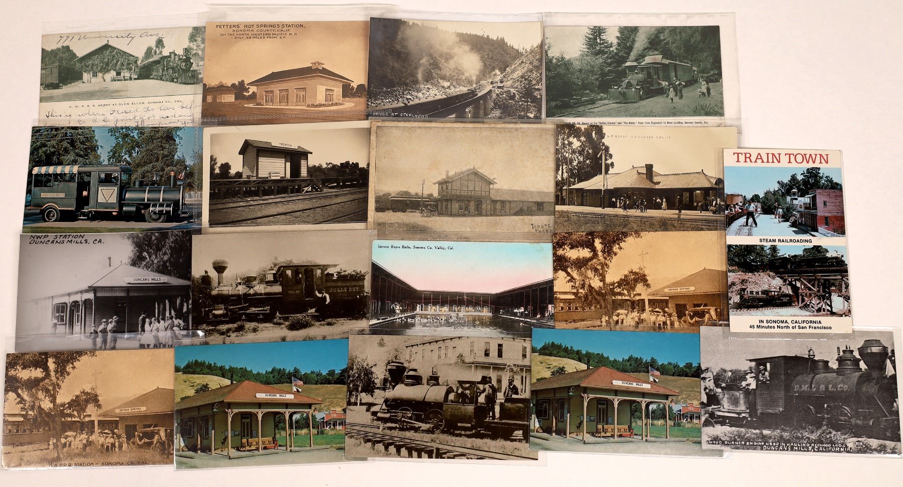 Nice collection of Sonoma area RPC'sand postcards focused on the town of Duncan Mills and the resorts located there. Cards include the Duncan Mills Northwestern Pacific RR depot in the past and present, Fettersd Hot Springs Station, the Glen Ellen Station and more. Some cards are used, some are blank. Please see photos for more detail and condition.