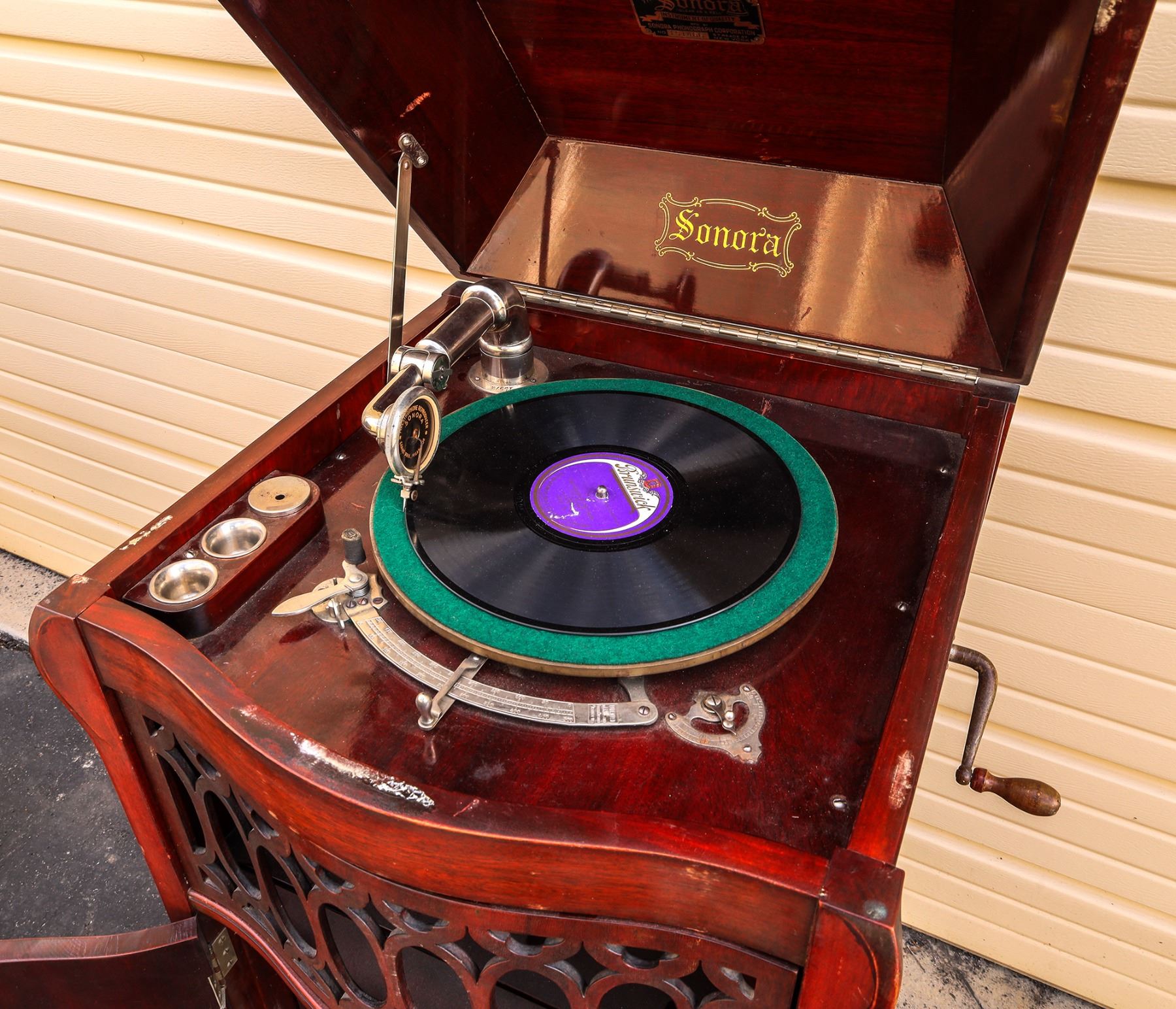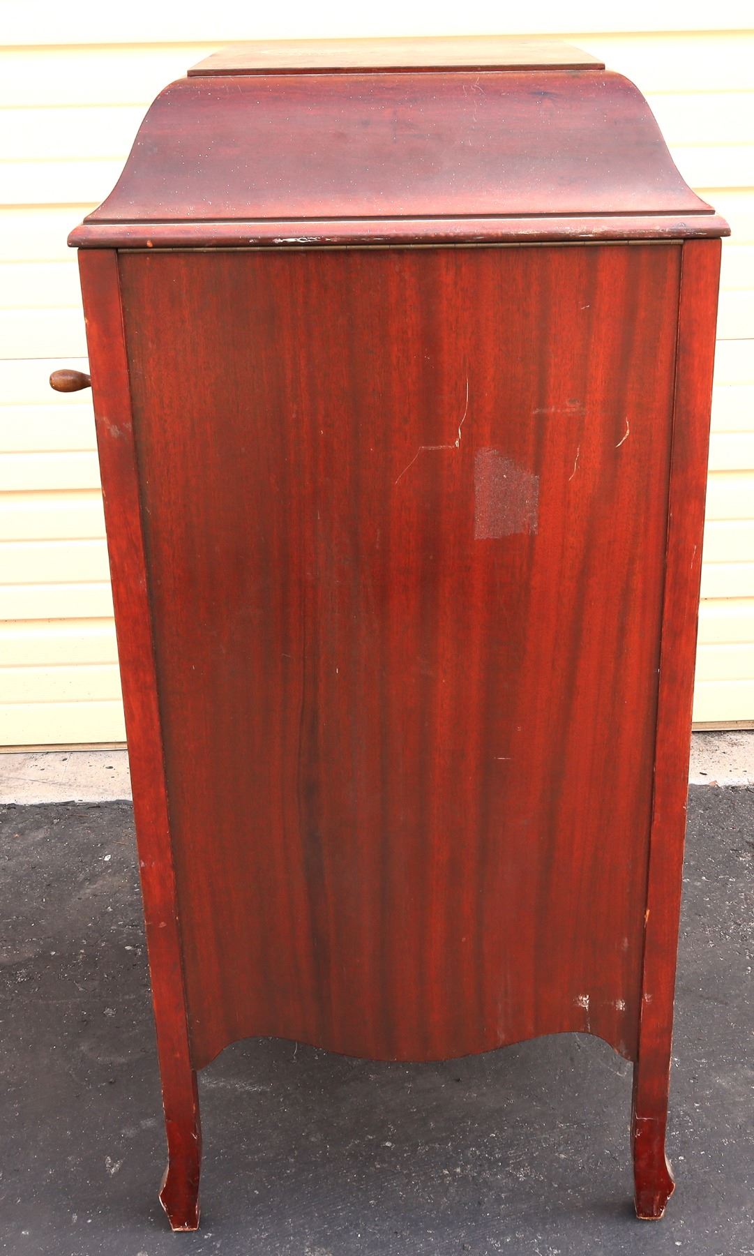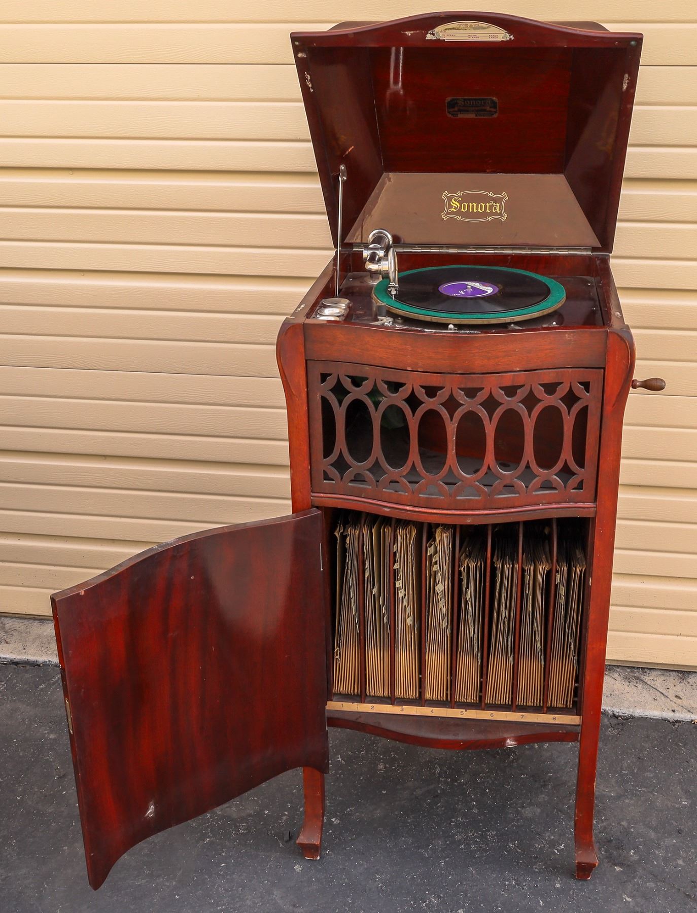 A Sonora Phonograph serial number 151466. This is a beautiful piece of furniture and slightly fancier than the top of the line Imperial model. The cabinet measures 18" deep, 20" wide and 43" tall. This is out of New York and has some blemishes, but all in all, in nice condition for it being a century old. New York New York