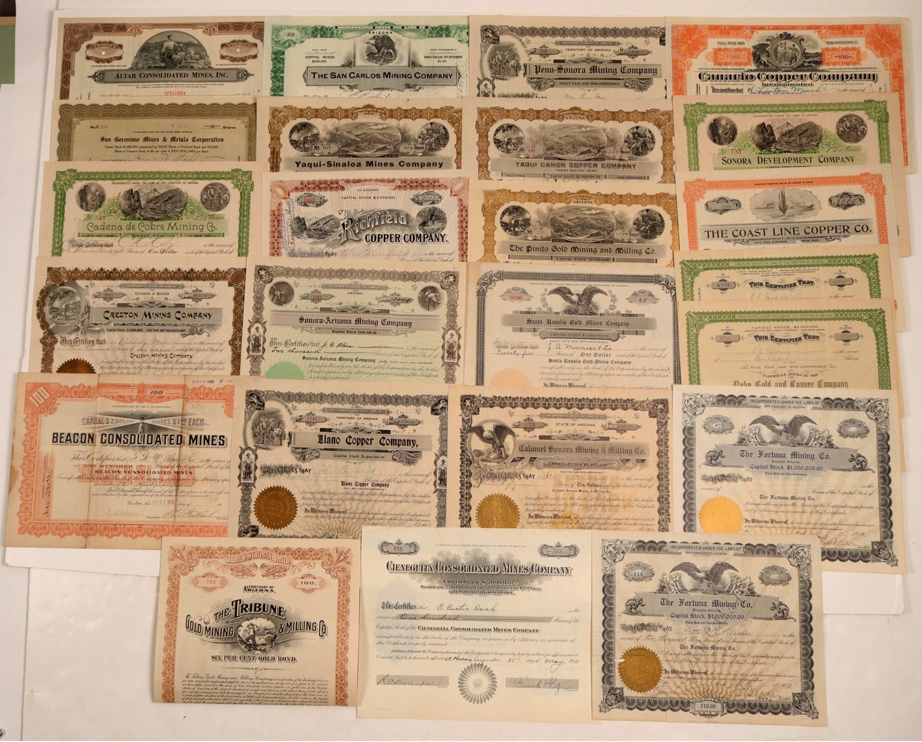 Lot of 24, most different. Includes: Penn-Sonora MC (1911, Planchas); San Geronimo Mines & Metals Corp. (1918); Altar Cons. Mines, Inc. (specimen); San Carlos MC (1908); Canario Copper Co. (1924); Calumet Sonora M&MC (1912); Beacon Cons. Mines (1912); Llano Copper Co. (1908); Santa Rosalia GMC (1910); Tribune GM&MC ($100 bond, 1908); Sonora-Arizona MC (1927); Creston MC (1908); Pinito GM&MC (1903); Cadena de Cobre MC (1906); Yaqui-Sinaloa MC (1909); Yaqui Canon Copper Co. (1904); Richfield Copper Co. (1911); Cieneguita Cons. MC (1913); and more. Please inspect. City: Sonora State: Mexico Date: 1903-1927