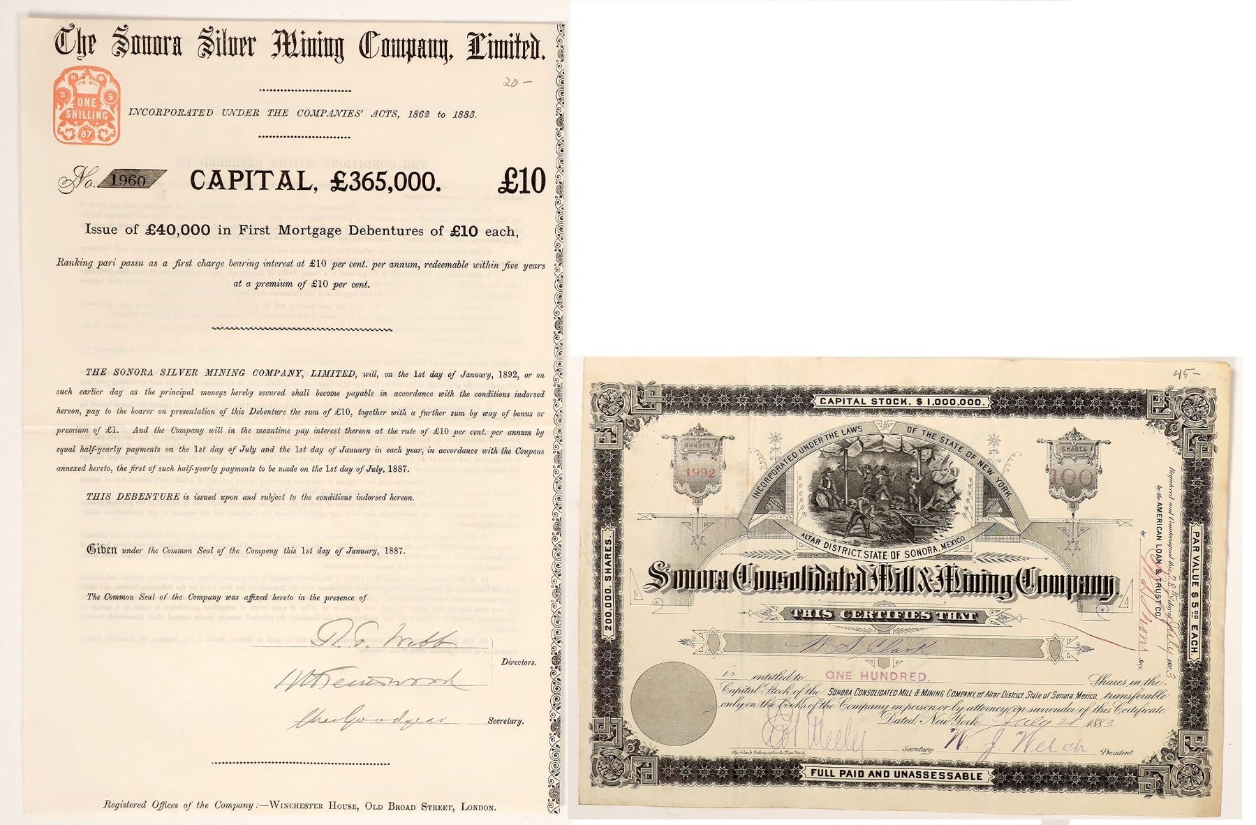 Issued-1887 Sonora Silver Mining bond and 1883 Sonora Cons. Mill & Mining stock, located in Altar district. Sonora is Mexicoís top producer of copper and gold, producing over 80 percent of the total production.[ Sonora Mexico