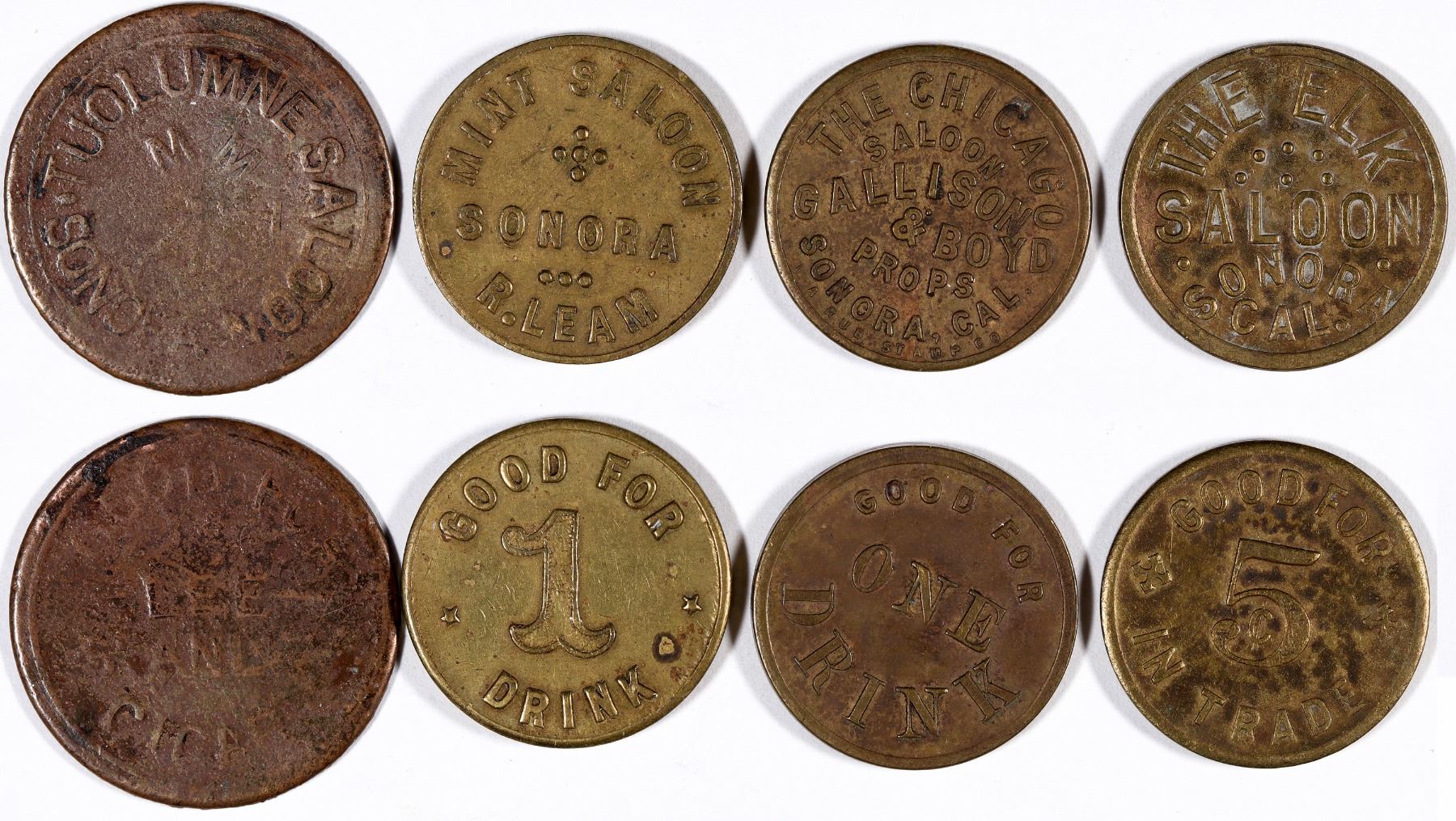 Lot of four saloon tokens from Sonora: 1) THE CHICAGO / SALOON / GALLISON / & BOYD / PROPS / SONORA, CAL. / L.A. RUB. STAMP CO. // GOOD FOR / ONE / DRINK; Br., rd., 21 mm. 2) THE ELK / SALOON / SONORA / CAL. // GOOD FOR / 5¢ / IN TRADE; Br. rd., 21 mm. 3) MINT SALOON / SONORA / R. LEAM // GOOD FOR / 1 / DRINK; Br. rd., 21 mm. 4)