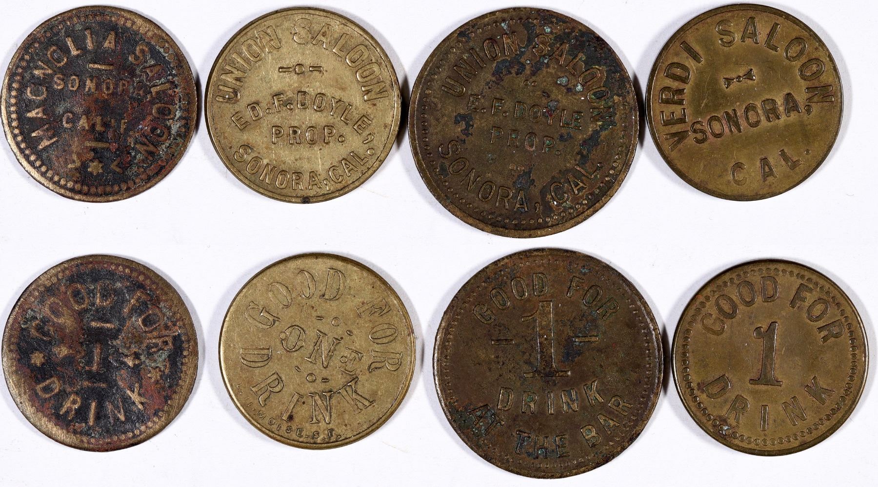 Lot of four saloon tokens from Sonora: 1) UNION SALOON / E.F. DOYLE / PROP. / SONORA, CAL. //GOOD FOR / 1 / DRINK / AT THE BAR; Br., rd., 25 mm. 2) UNION SALOON / ED. F. DOYLE, / PROP. / SONORA, CAL. // GOOD FOR / ONE / DRINK; Br. rd., 21 mm. 3) VERDI SALOON / SONORA, / CAL. // GOOD FOR / 1 / DRINK; Br. rd., 21 mm. 4) MAGNOLIA SALOON / SONORA, / CALIF. // GOOD FOR / 1 / DRINK; Br. rd., 21 mm. Ex: Ron Lerch collection.