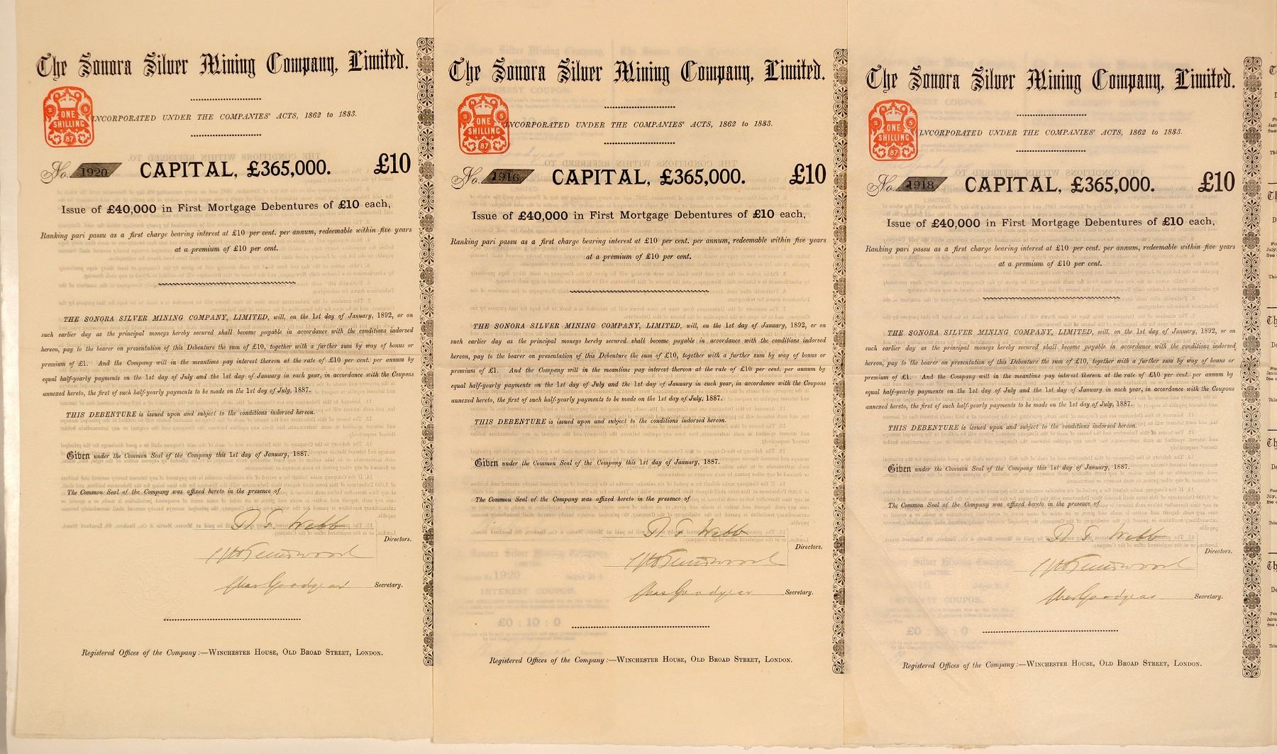 Lot of 3 ten pound bonds issued in 1887 in London. Not cancelled. All have coupons remaining. Incorporated under the Companies' Acts, 1862-1883. 17.25 x 10" Folds, creases. The company's mining properties were the Huruapa (in Chihuahua) and the Almada (near Almos), located in the 1860s. [Ref: The Standard, 07 Dec 1867] Houghton Estate Collection