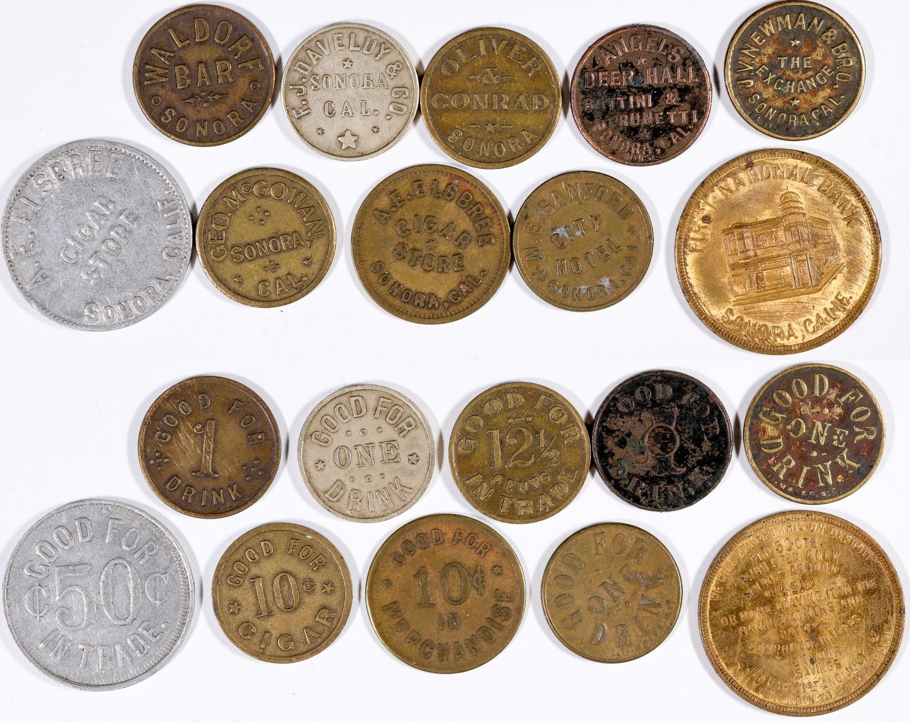 Lot of ten tokens from Sonora: 1) OLIVER / & / CONRAD / SONORA // GOOD FOR / 12½ / CENTS / IN TRADE; Br. rd., 21 mm. 2) ANGELS / BEER HALL / BOTTINI & PRUNETTI / SONORA, CAL. / MOISE // GOOD FOR / 1 / DRINK; Br., rd., 21 mm. 3) FIRST NATIONAL BANK / SONORA, CALIF. // WE WILL ACCEPT THIS ON DEPOSIT / FOR 50 CTS. / IF YOU OPEN A NEW / SAVINGS ACCOUNT / OF $5.00 / OR MORE LEAVING IT IN THE / BANK 12 MONTHS AND / PAY 4% / COMPOUND INTEREST / ON YOUR / SAVINGS / JANUARY 1ST AND JULY 1ST / ONLY ONE COIN TO EACH ACCOUNT; Br. rd., 31 mm. 4)A.E. ELSBREE / CIGAR / STORE / SONORA, CALIF. // GOOD FOR / ¢50¢ / IN TRADE.; Al. rd. 29 mm. 5) A.E. ELSBREE / CIGAR / STORE / SONORA, CAL. // GOOD FOR / 10¢ / IN / MERCHANDISE; Br. rd., 24 mm.6) M.E. SANFORD / CITY / HOTEL / SONORA, CAL. // GOOD FOR / ONE / DRINK; Br., rd., 21 mm. 7) F .J. DAVELUY & CO. / SONORA / CAL. //GOOD FOR / ONE / DRINK; Wm, rd., 21 mm. 8) WALDORF / BAR / SONORA // GOOD FOR / 1 / DRINK; Br., rd., 21 mm. 9) GEO. McGOWAN / SONORA, / CAL. // GOOD FOR / 10¢ / CIGAR; Br., rd., 21 mm. 10 ) J.V. NEWMAN & BRO. / THE / EXCHANGE / SONORA, CAL. / L.H. MOISE. S.F. // GOOD FOR / ONE / DRINK / L.H. MOISE. S.F.; Br., rd., 21 mm. Ex. Ron Lerch collection.