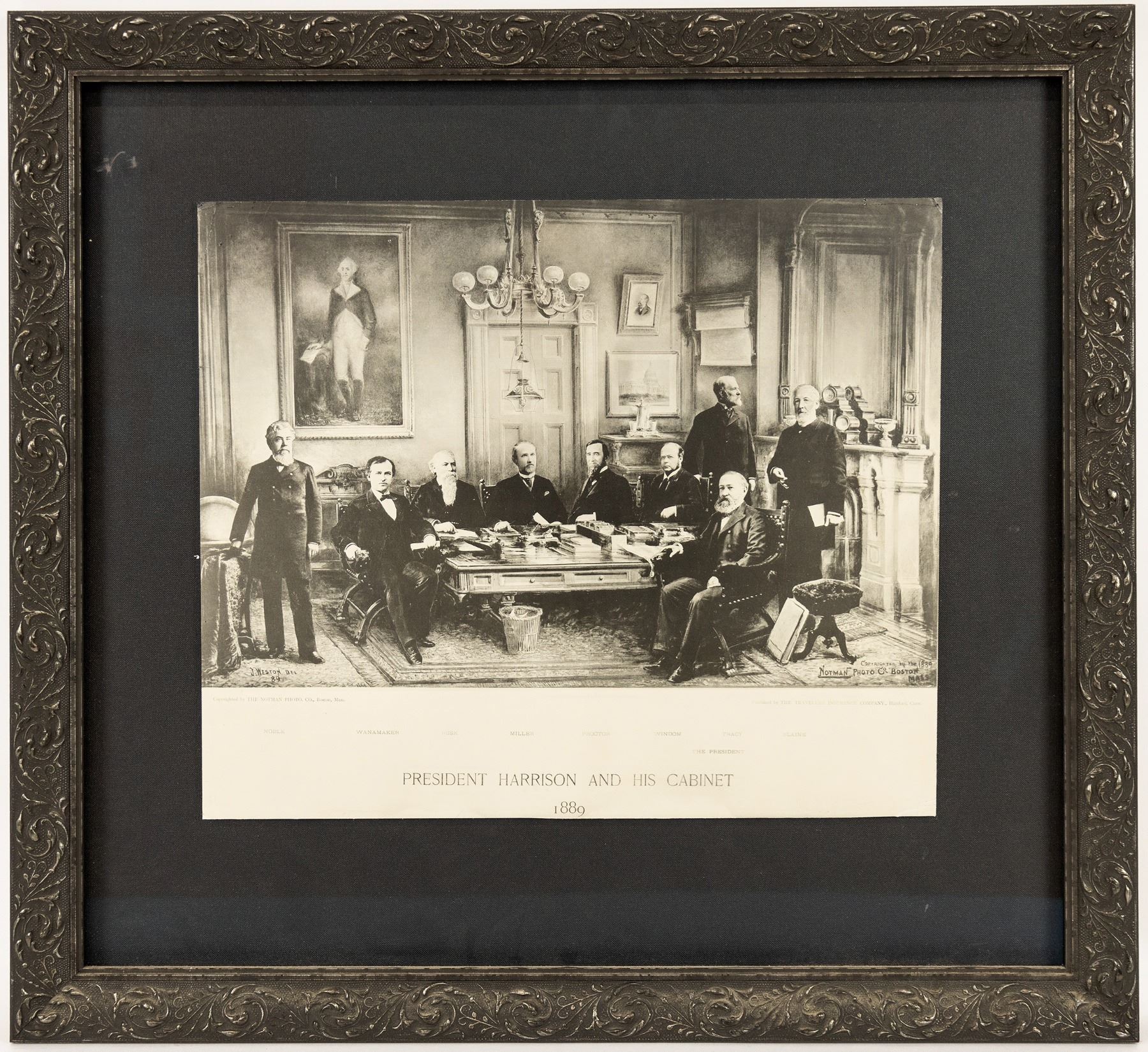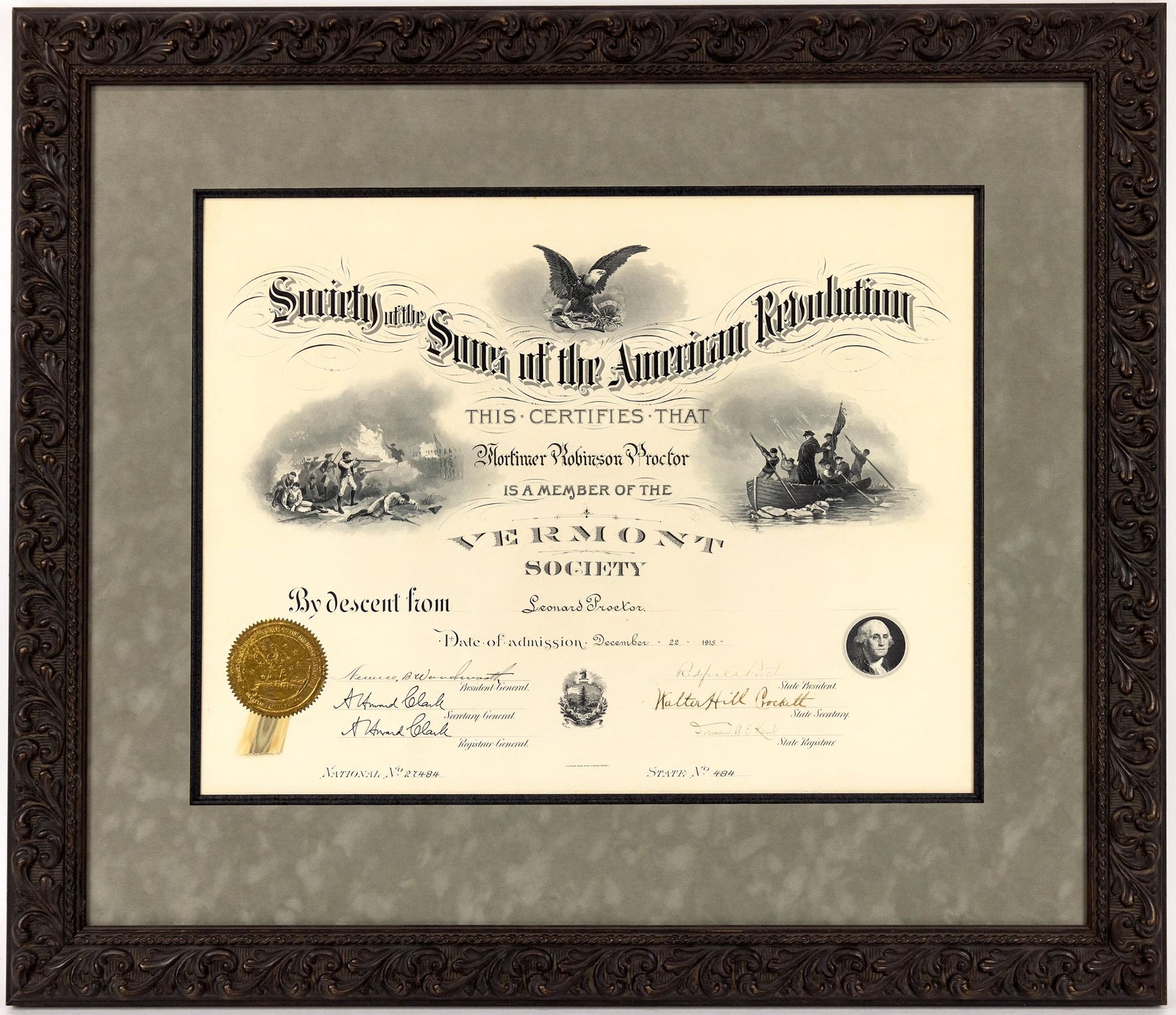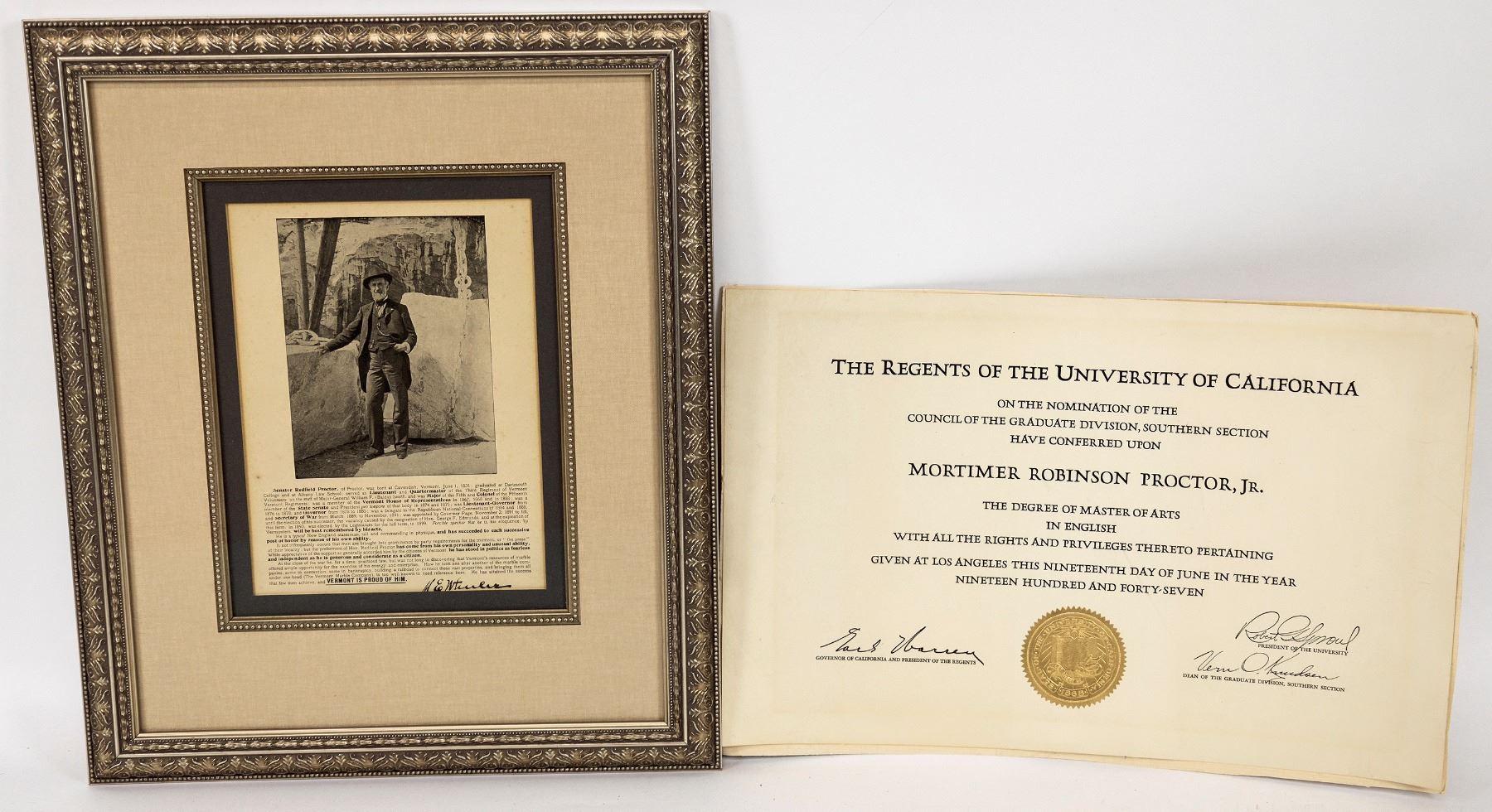 Framed Society of the Sons of the American Revolution member certificate, 1915, 28x33". MR Proctor Jr. graduate degree. Governor Fletcher D Proctor and staff framed photo, 20x22". Framed print of President Harrison and Proctor 23.5x25.5". Framed Senator Redfield Proctor fact sheet, 18x15". "Mortimer Robinson Proctor (May 30, 1889 " April 28, 1968), known as Mortimer R. Proctor, was an American politician from Vermont. He served as the 62nd lieutenant governor of Vermont from 1941 to 1945, and as the 66th governor of Vermont from 1945 to 1947. Proctor was the grandson of Redfield Proctor, the son of Fletcher D. Proctor, and the nephew of Redfield Proctor Jr., who all previously served as Governor of Vermont. He had one son, Mortimer Robinson Proctor Jr. (1916-1977)." from Wikipedia