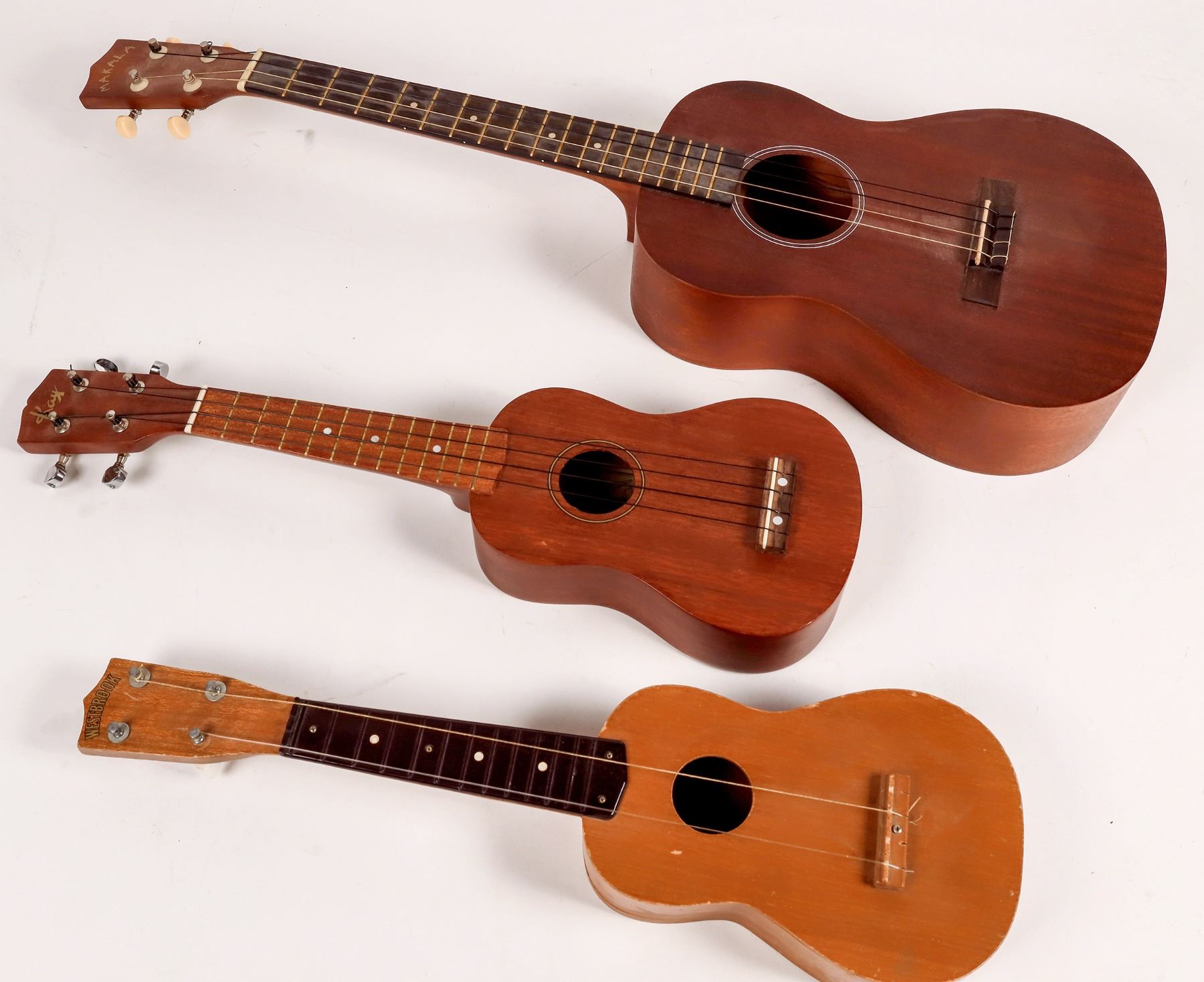 This lot contains a Makala baritone ukulele MB-K 1110; a Kay soprano ukulele model U-10, and a Westbrook soprano souvenir ukulele. The Makala is in excellent condition, koa wood construction. The Kay is also in excellent condition, koa construction. The Westbrook is in good condition with two strings.