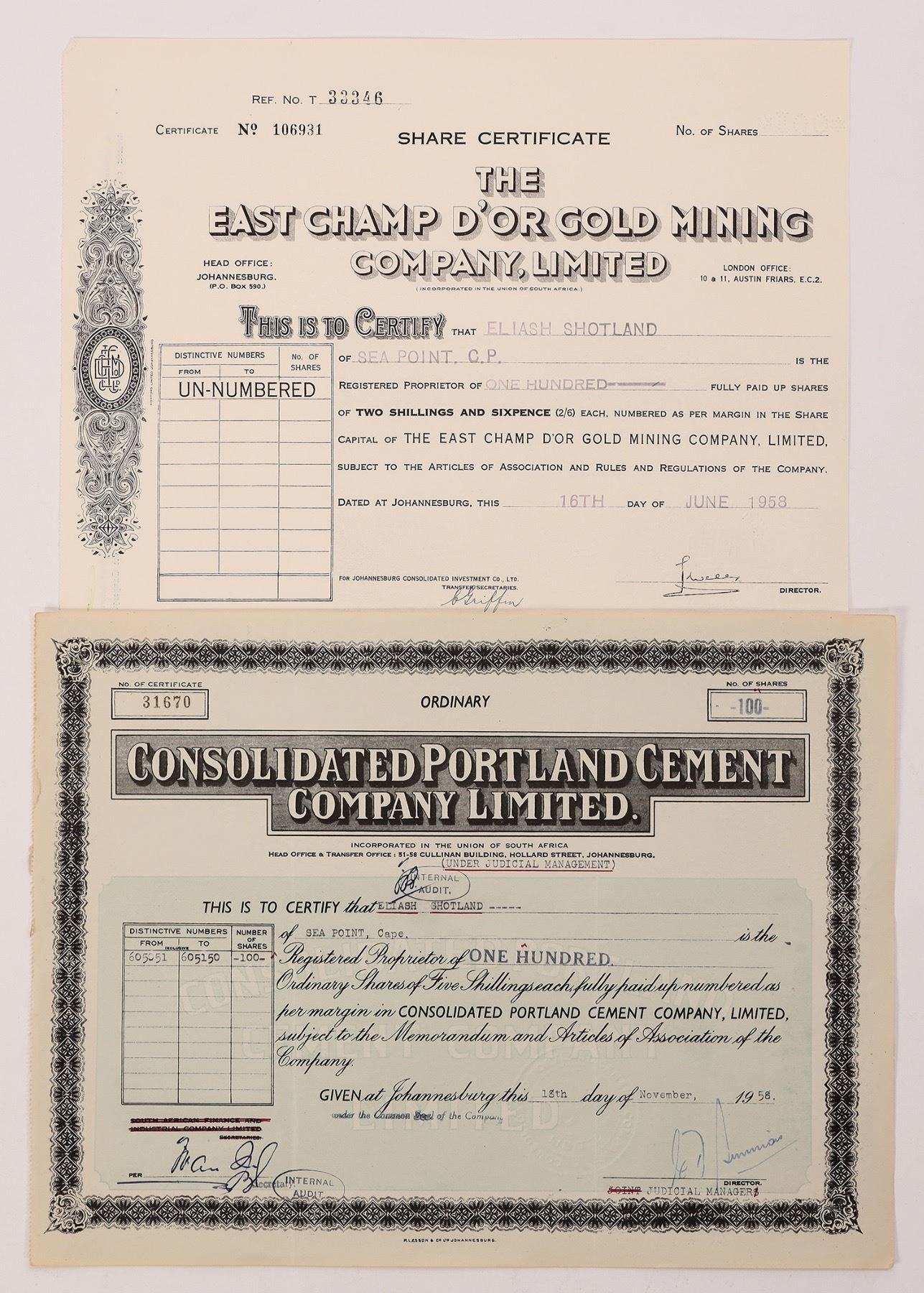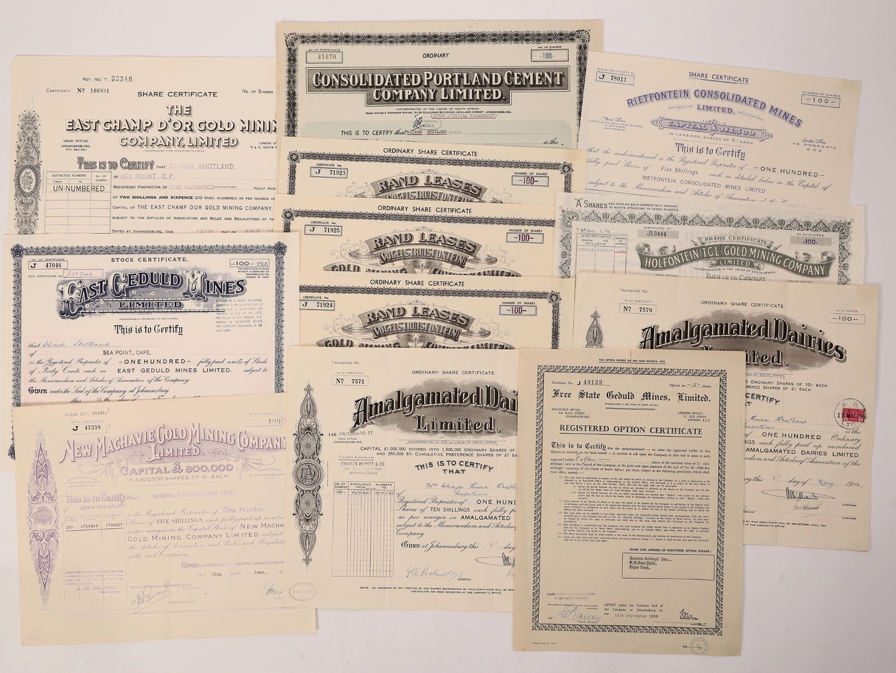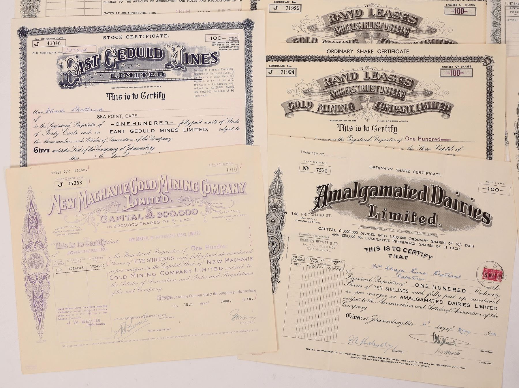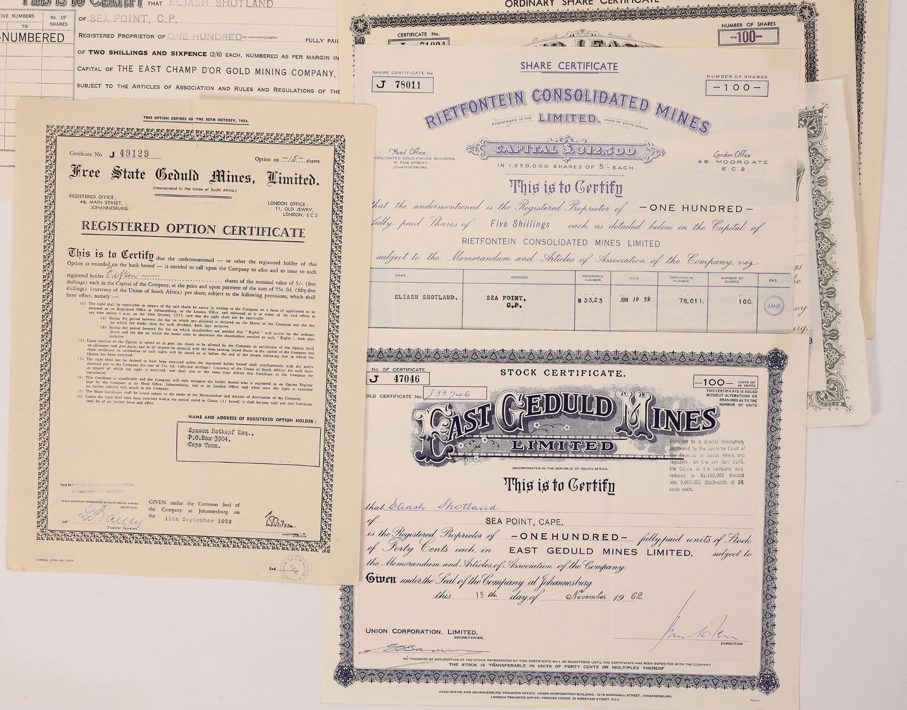 10. c. 1946-62 South Africa mining stocks. New Machavie Gold, Free State Geguld, East Geguld, Vogelstruisfontein, Rietfontein Cons., Cons. Portland Cement, East Champ D'or etc.