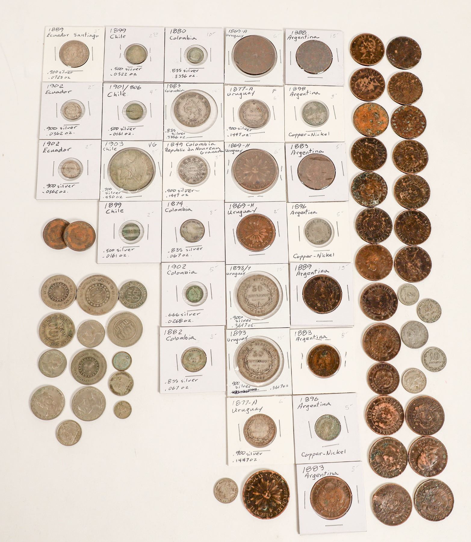 Lot of South American coins: Argentina, about 30 coins mostly 1800s; Brazil, about a dozen, mostly 1800s; Columbia, six coins,1849-1902, all silver; Peru, two 1895 coppers; Ecuador, three silver coins 1889 & 1902; Chile: four silver coins 1899-1903; Uruguay, nine coins 1869-1893