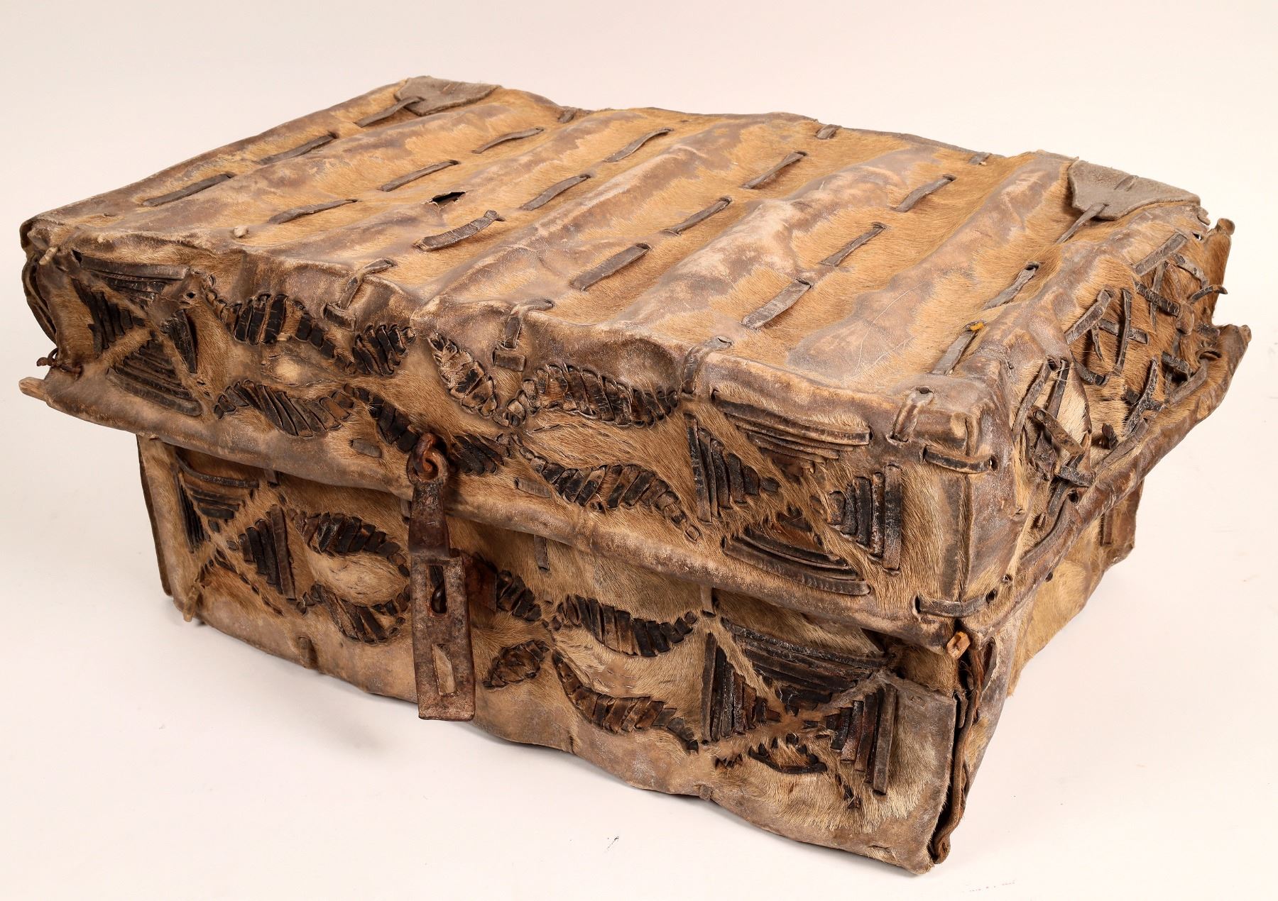 An old, perhaps 100 years of age, hide and hair chest purchased in South America a long time ago. Made by natives in well used condition. Majority of wear on the bottom with secondary wear on top. Not much internal wear. 1 side handle present, 1 missing. An unusual chest with a heavy metal clasp in a style we have not seen before. 10x21x15". South America