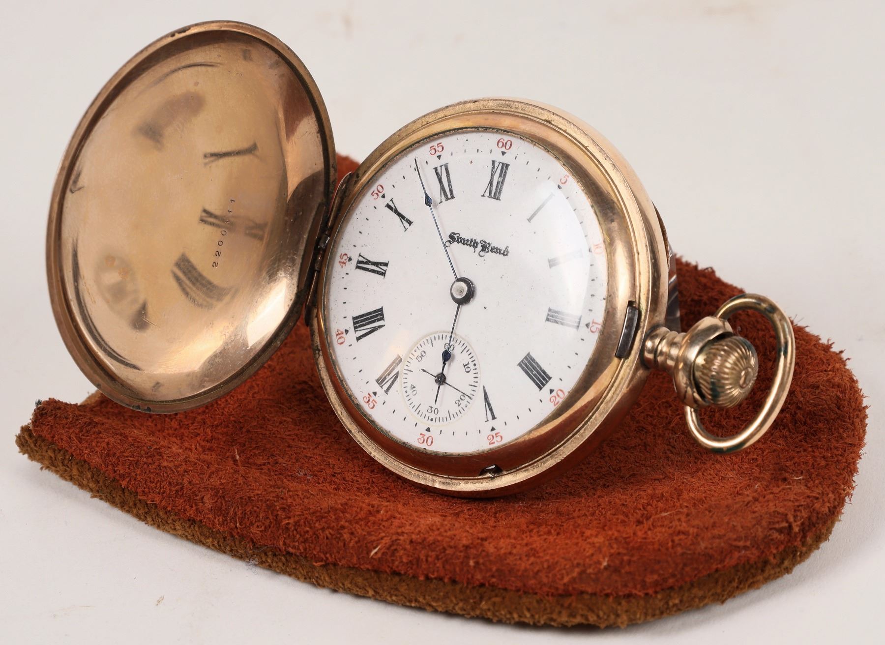 A beautiful South Bend lever set pocket watch. It measures size 25 (2inches) across with Roman numerals. It's in what appears to be a gold filled engraved design hunters case. It was wound and hour ago and is still running and keeping time, although I would suggest a good cleaning. The serial number is 2200111 which gives it a manufacture period of the early 1900s up to the early 1920s A beautiful piece. Please see photos for more detail. South Bend Indiana
