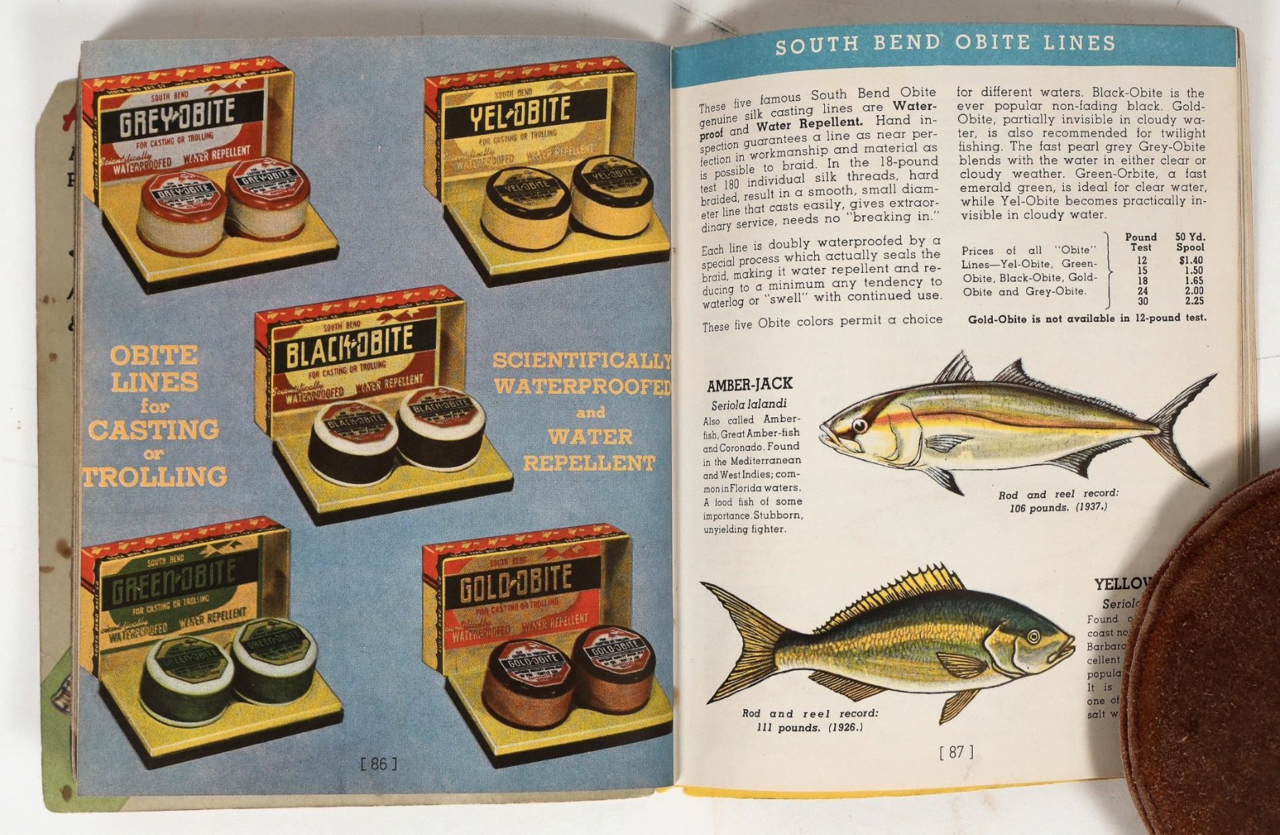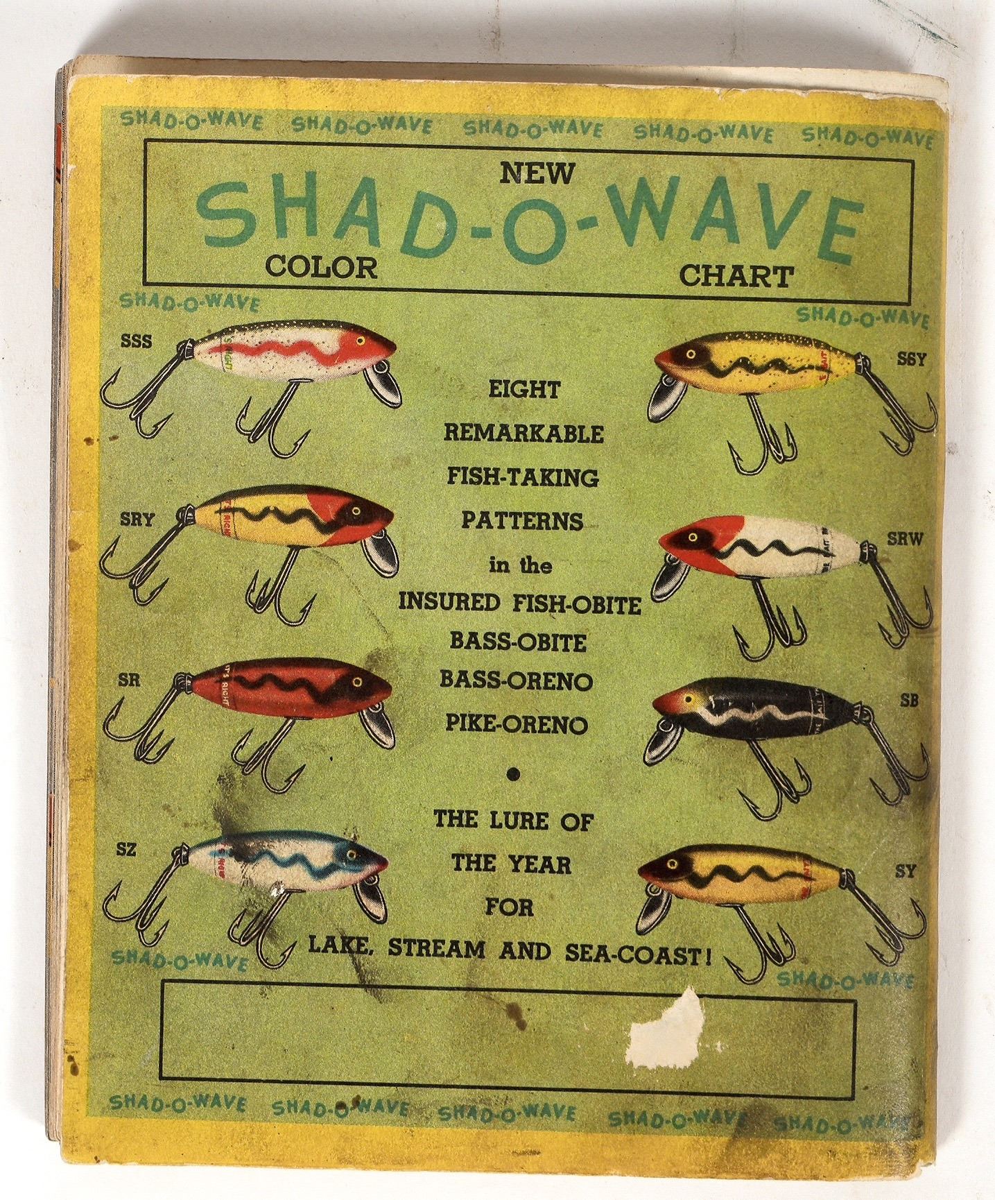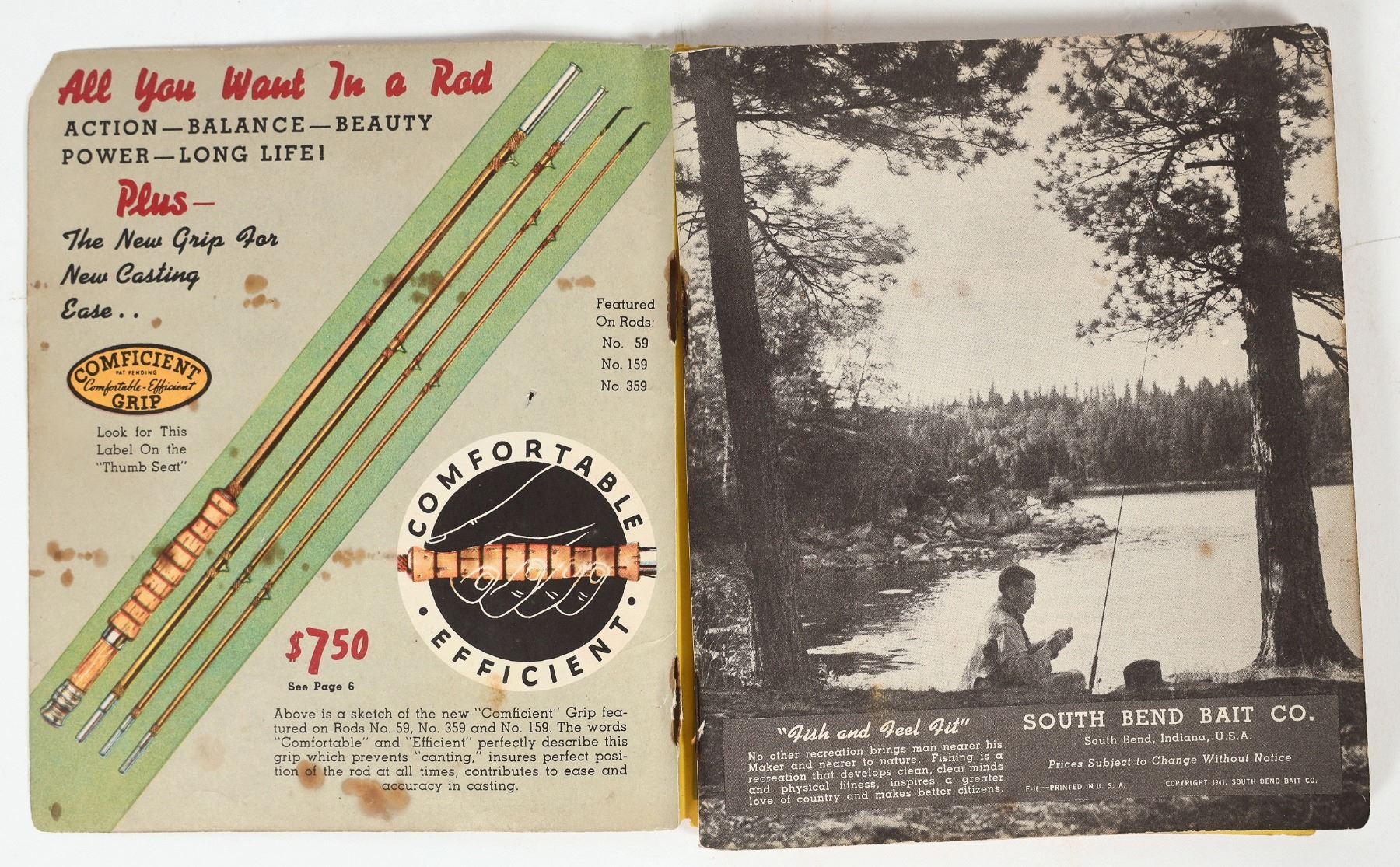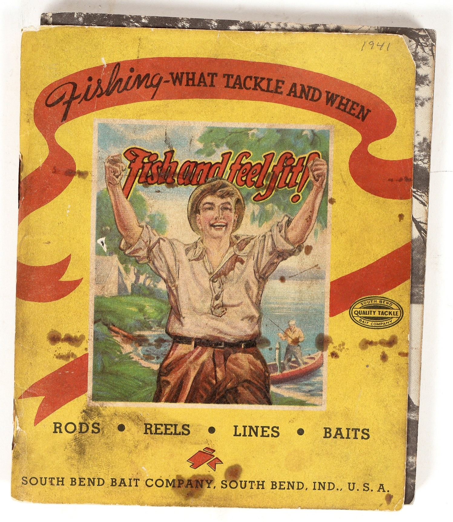 1941 color illustrated South Bend Bait catalog. Rods, reels, lures and game fish. 136pp with index. Front cover has a small upper right chip.